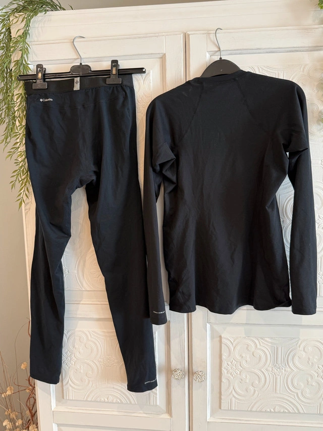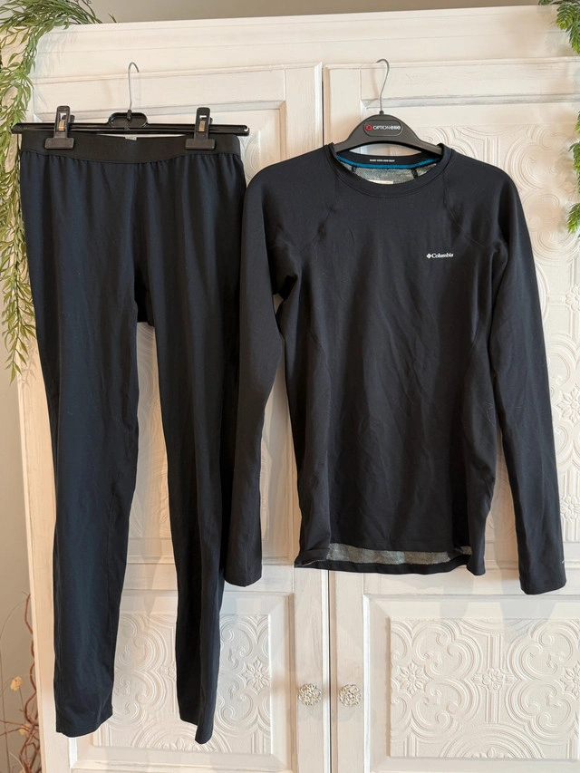 Stay warm and comfortable with this used Columbia baselayer set, perfect for any outdoor activity. It includes both the top and bottoms, offering full coverage and insulation. Omni-Heat™ thermal-reflective breathable lining retains warmth using silver dots that reflect body heat, so you stay warm and comfortable as temps drop Captures and neutralizes odor for long-lasting freshness Uses: Ski / Snowsports ImportedIt is in great condition, ready for its next adventure. * Brand: Columbia * Size: S pick up Mahogany SE or Quarry Park SE