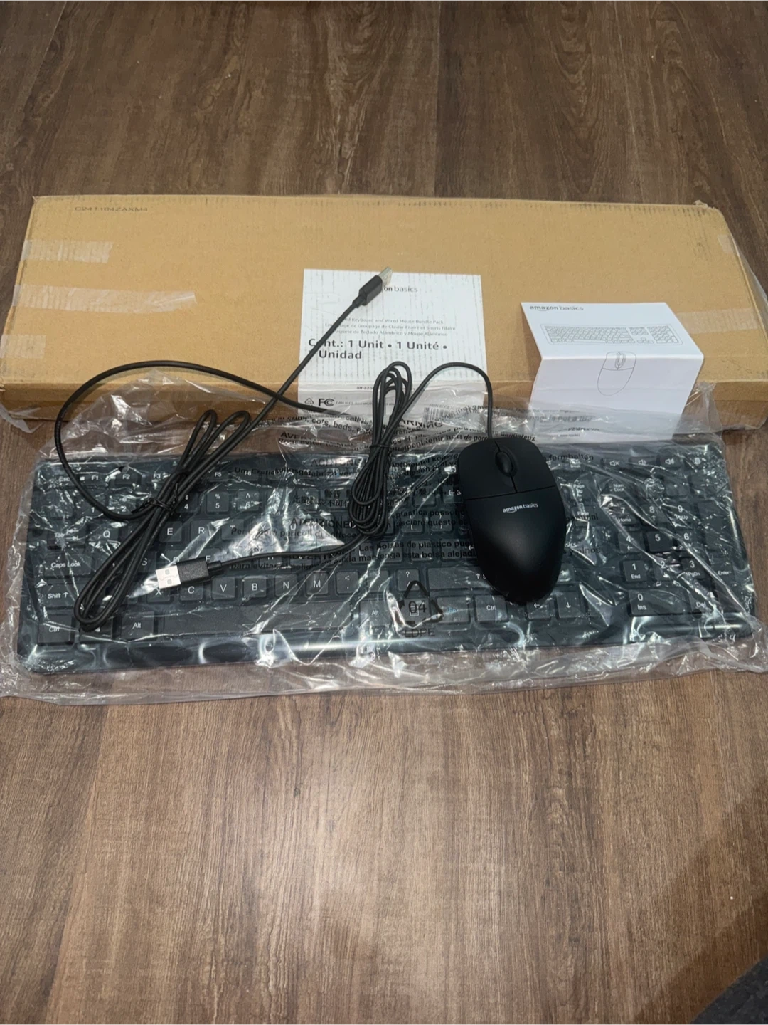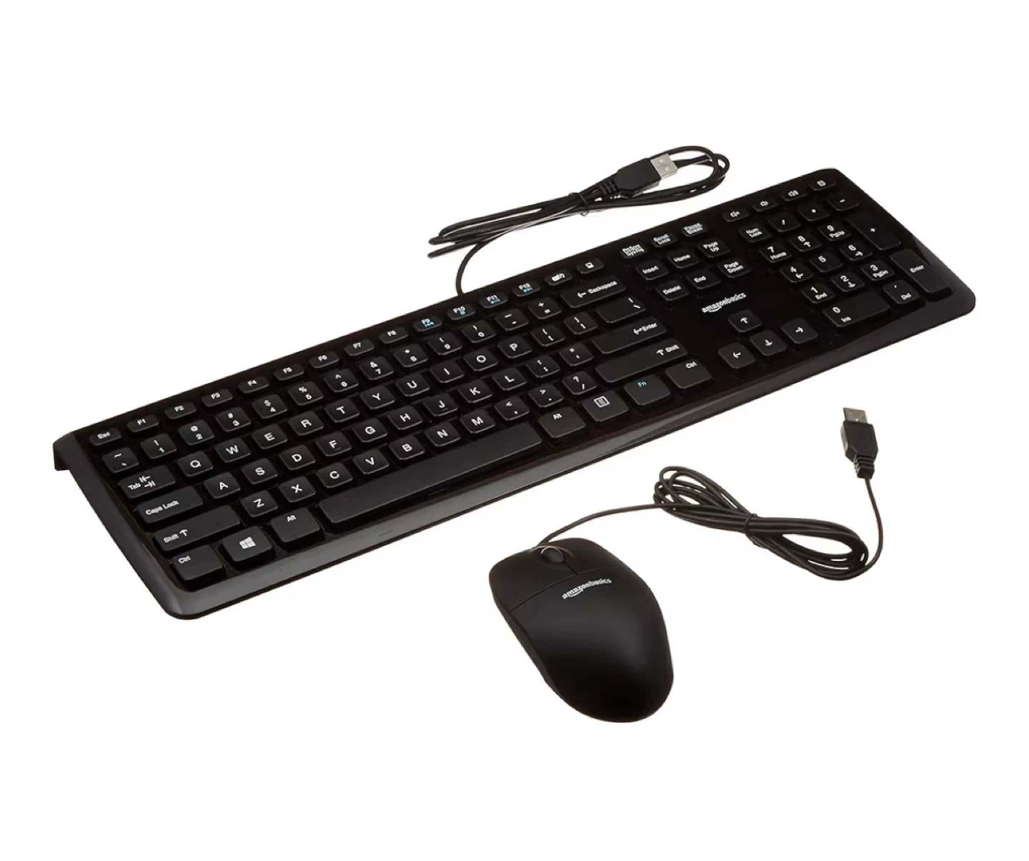 This is a black, wired keyboard and mouse set from Amazon Basics. It includes the keyboard, mouse, and necessary USB cables for connection. Both items are black and designed for everyday use.