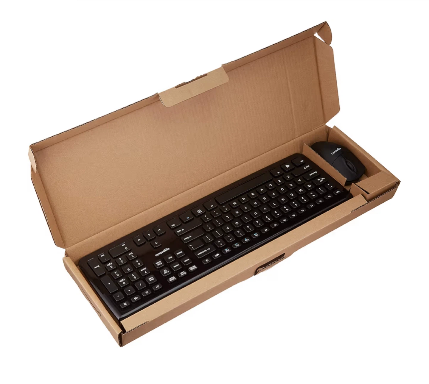 This is a black, wired keyboard and mouse set from Amazon Basics. It includes the keyboard, mouse, and necessary USB cables for connection. Both items are black and designed for everyday use.