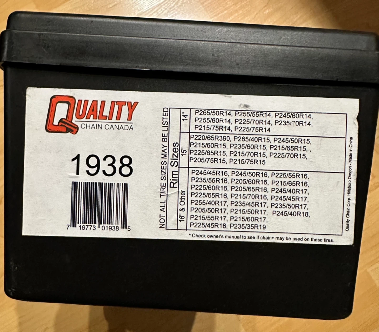 Brand new Quality Chain Canada “Magic Grip” (#1938) cable-style tire chains. Chains have never been unraveled or used. They are designed for both radial and regular tires and provide reliable traction on snow and ice. Suitable for passenger vehicles. Instructions are enclosed for easy installation.