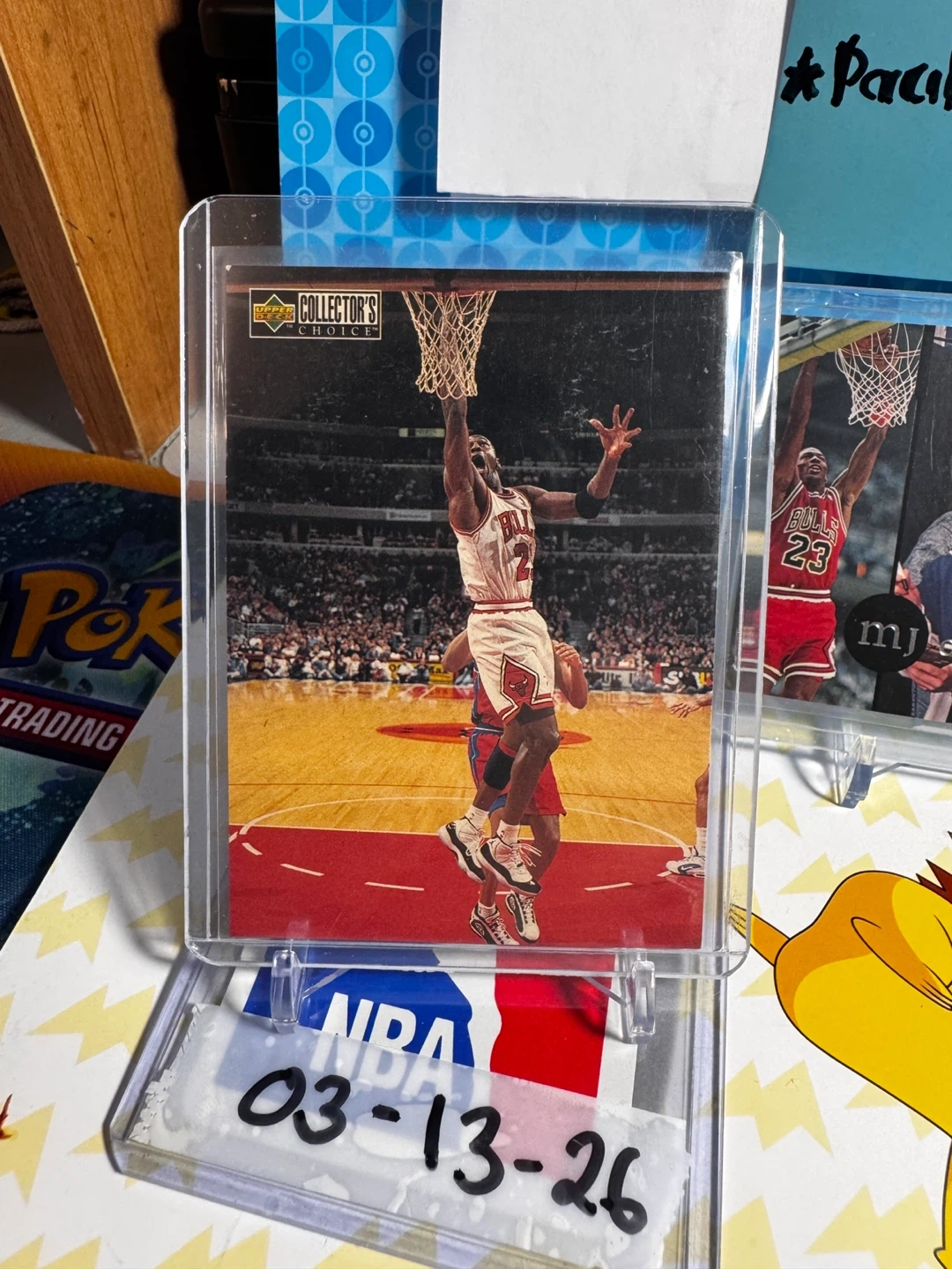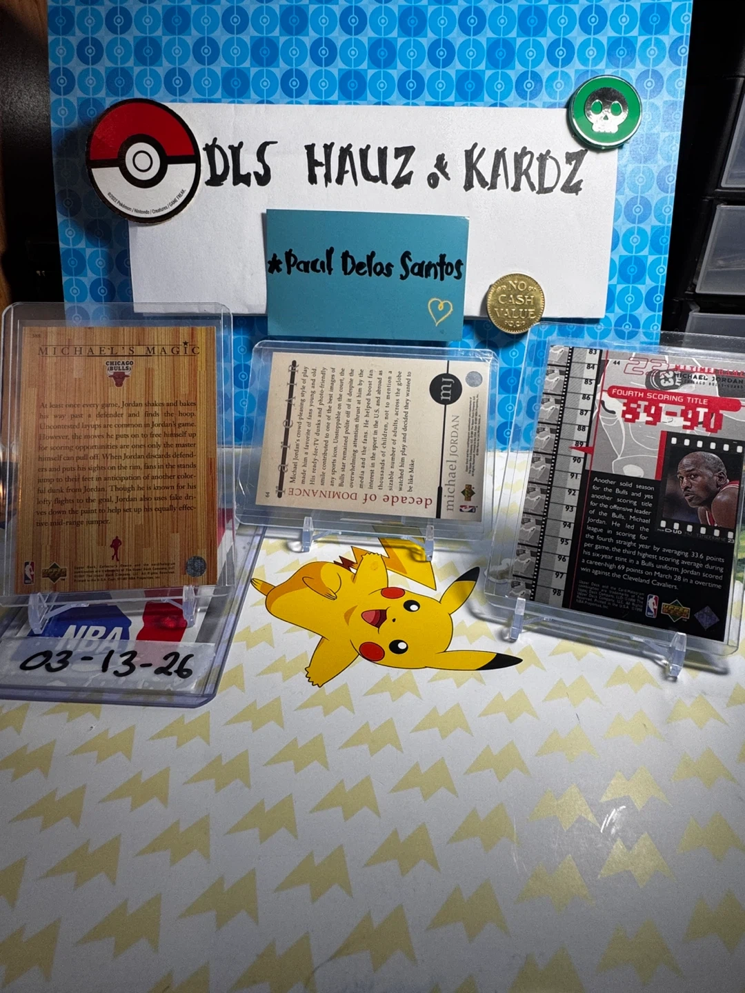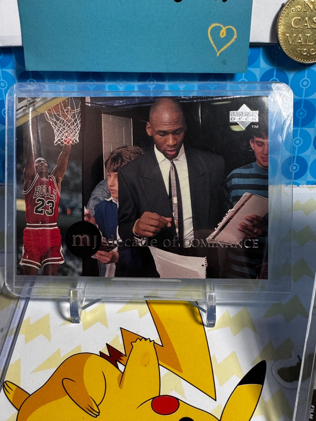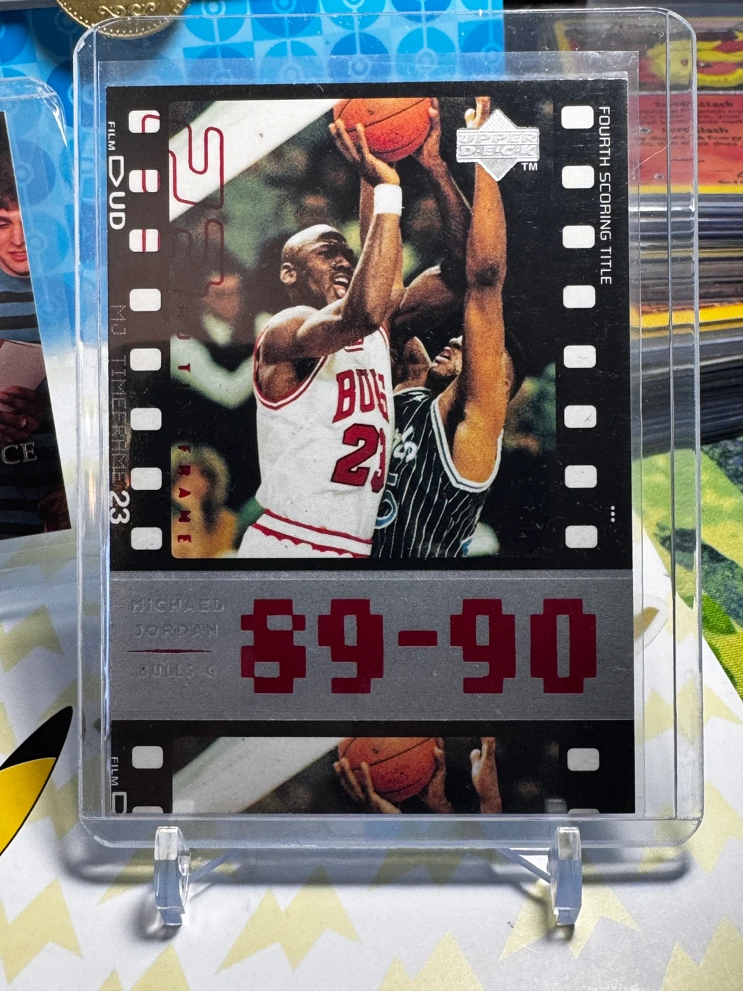 Collection of three Michael Jordan NBA trading cards. Features a 'Collector's Choice' card, a 'Decade of Dominance' card, and a 'Fourth Scoring Title' card from the '89-'90 season. Cards are in protective sleeves.