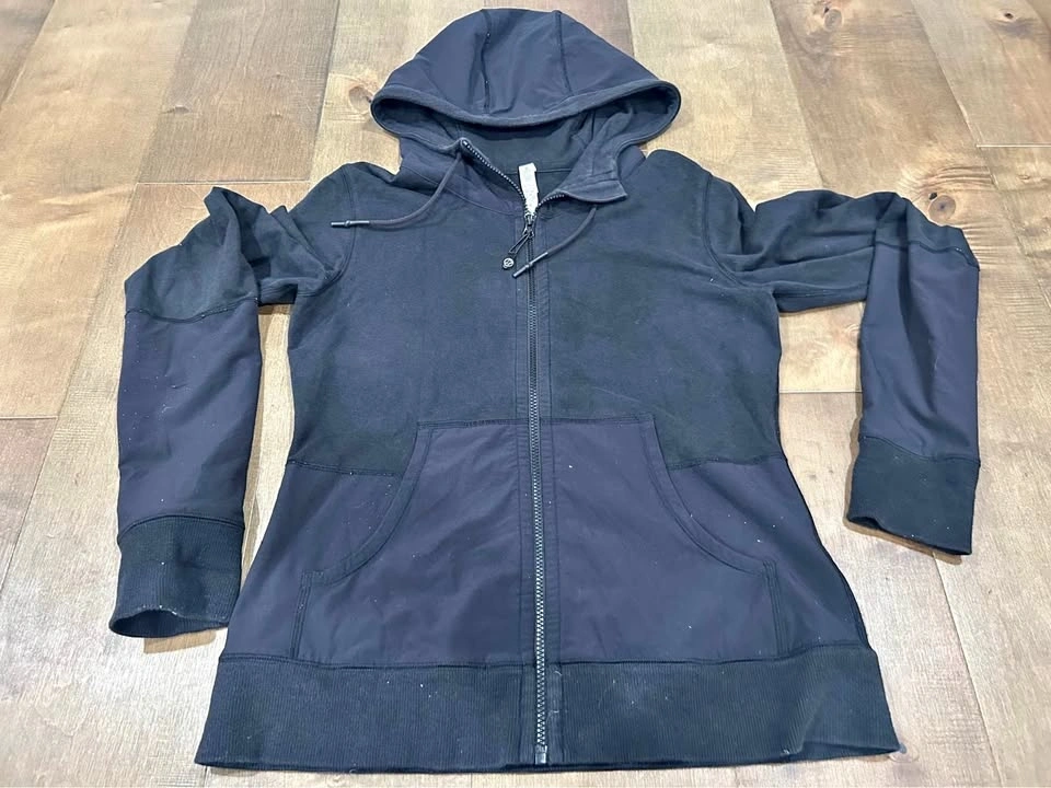 Retro Style Lululemon brand hoodie with zipper. Black. Cotton and k-way type fabric. Size 10. $25. Pick up only. Cash only. Closest intersection is 25th side road between 9th and 10th line.