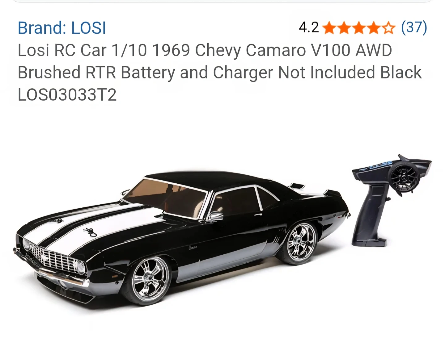 WANTED. Please contact me if you have this. It's a Losi RC car, 1/10 scale, modelled after a 1969 Chevy Camaro V100. It's a brushed RTR with All-Wheel Drive. . This would be great for hobbyists who enjoy scale replicas!