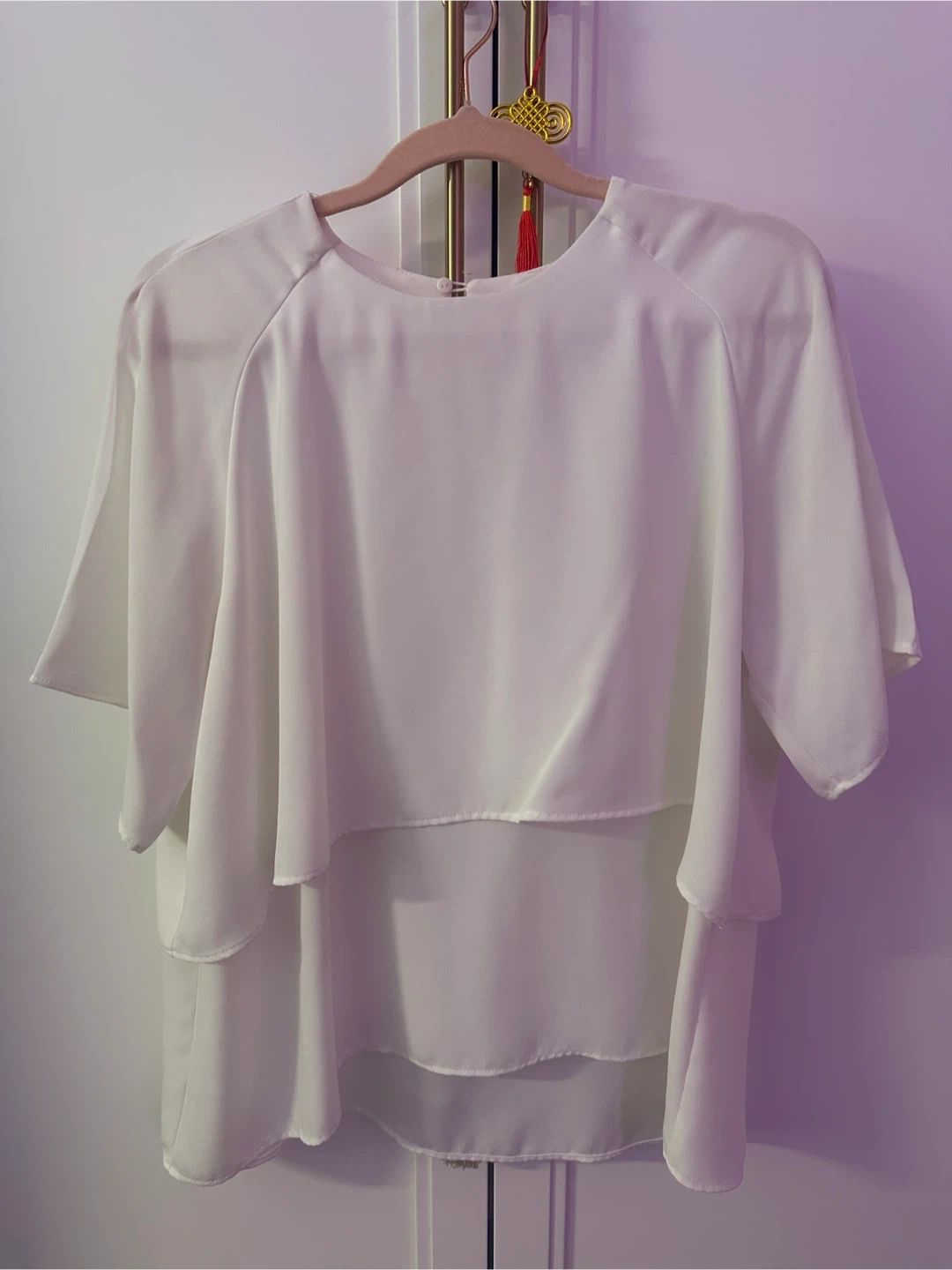 Zara Basic white blouse with a layered design. It's a size medium and made in Turkey. This lightweight top is suitable for various occasions. The fabric label is not attached anymore, however it is a fine flowy polyester fabric that is not see through. Please take into consideration that it has no stretch. It does not need ironing if you hang it dry. I am not sure if you use the drier. For measurements, please refer to the pictures.