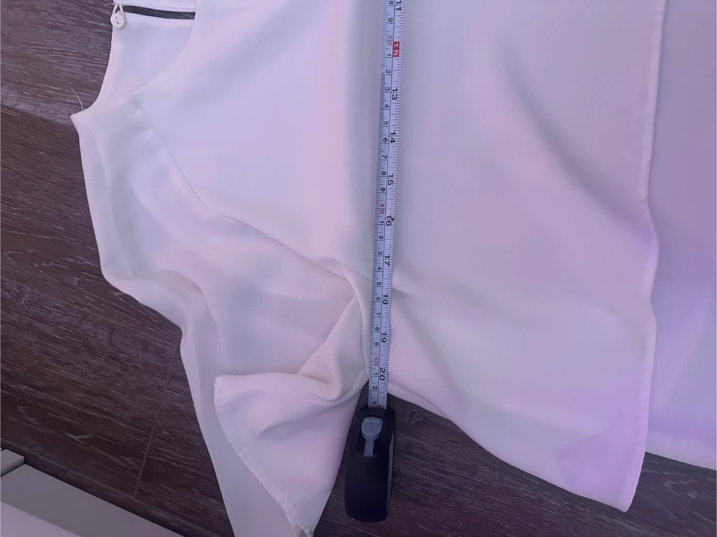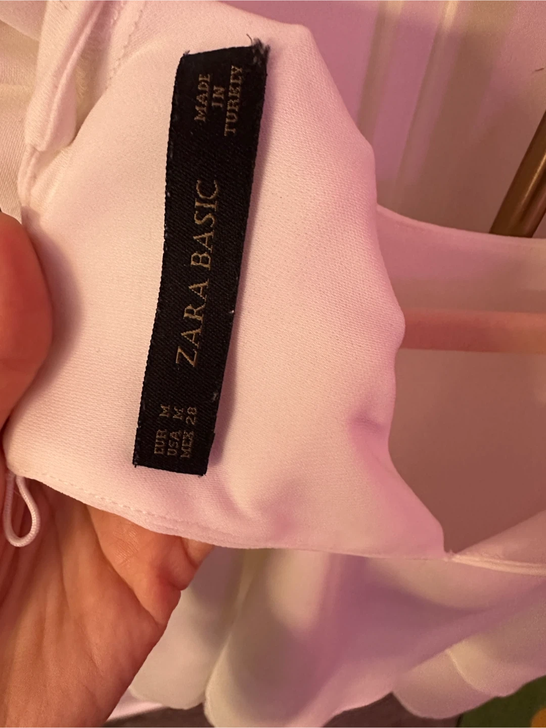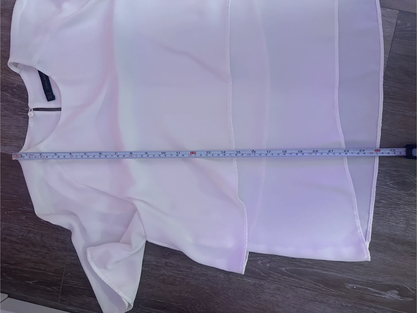 Zara Basic white blouse with a layered design. It's a size medium and made in Turkey. This lightweight top is suitable for various occasions. The fabric label is not attached anymore, however it is a fine flowy polyester fabric that is not see through. Please take into consideration that it has no stretch. It does not need ironing if you hang it dry. I am not sure if you use the drier. For measurements, please refer to the pictures.