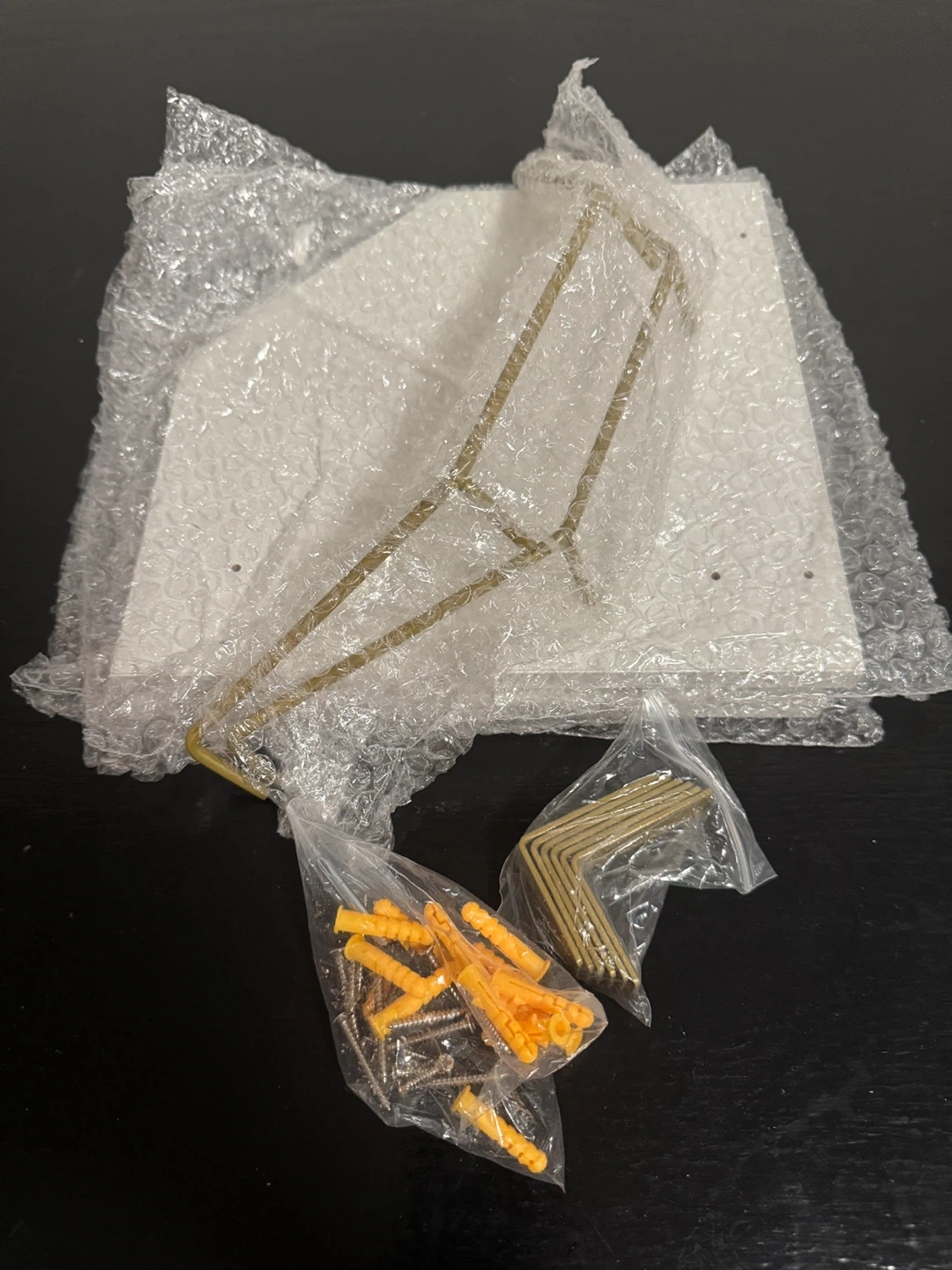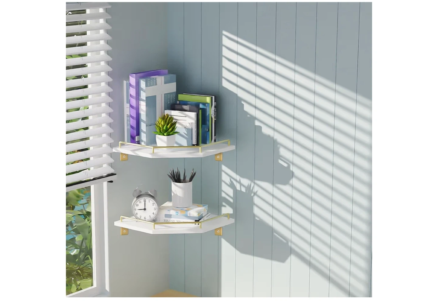 White corner shelves with gold metal guardrails, perfect for displaying small items. Each shelf measures 13.78 in (35 cm) across and 1.57 in (4 cm) deep. Load-bearing capacity is 22 lb (10 kg) per shelf. Includes mounting hardware for easy installation.