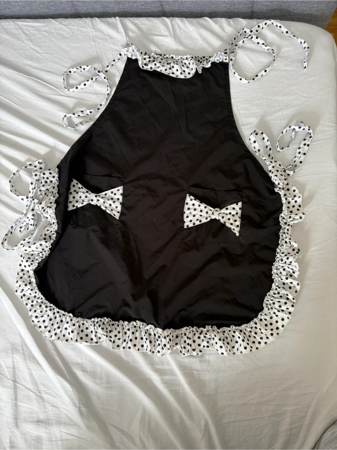 This is a cute black apron with white polka dot trim and two matching bow accents. It has ruffles along the edges and ties at the neck and waist. It's perfect for baking or as part of a costume!
