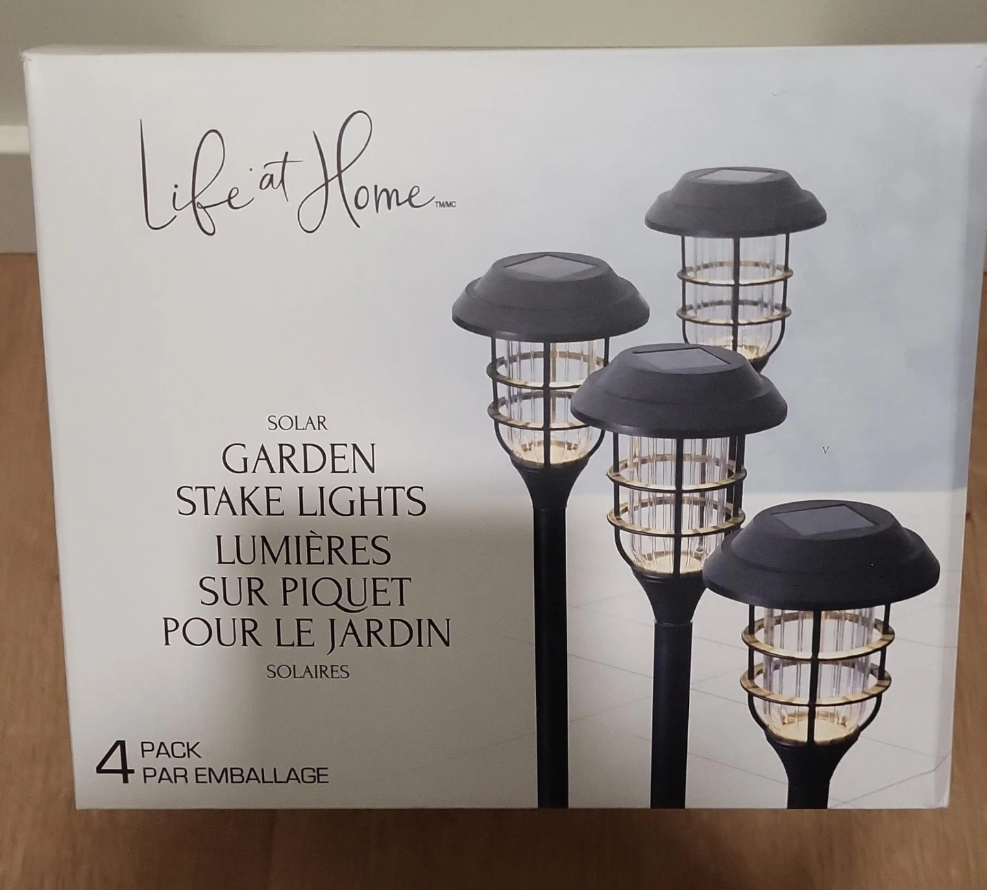 Set of 4 solar-powered garden stake lights. These lights are designed for outdoor use to illuminate your garden. Includes original packaging. New , never used