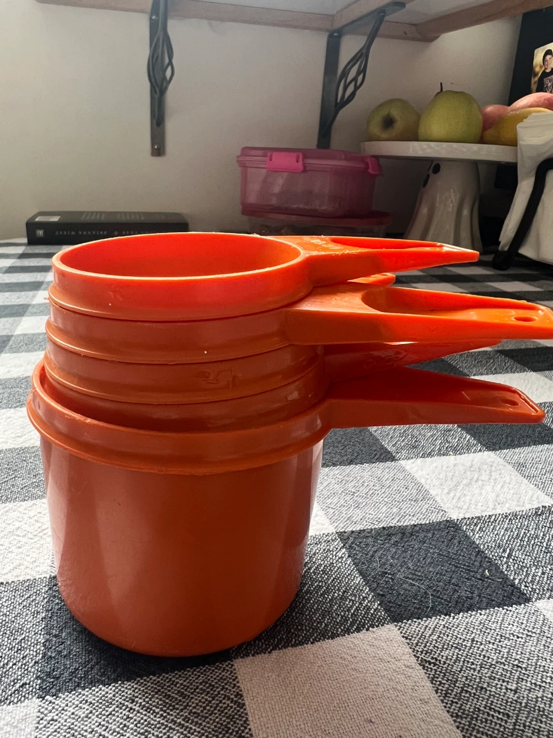 This is a set of five vintage orange plastic measuring cups. They're ideal for baking and cooking. Includes 1 cup, 1/2 cup, 1/3 cup, 1/4 cup, and 1/8 cup sizes.
