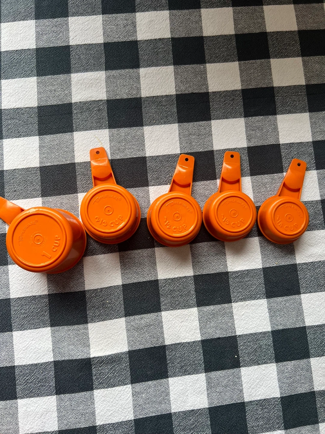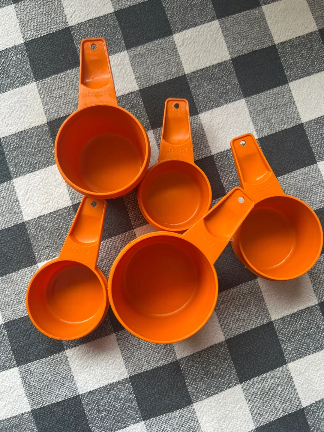 This is a set of five vintage orange plastic measuring cups. They're ideal for baking and cooking. Includes 1 cup, 1/2 cup, 1/3 cup, 1/4 cup, and 1/8 cup sizes.