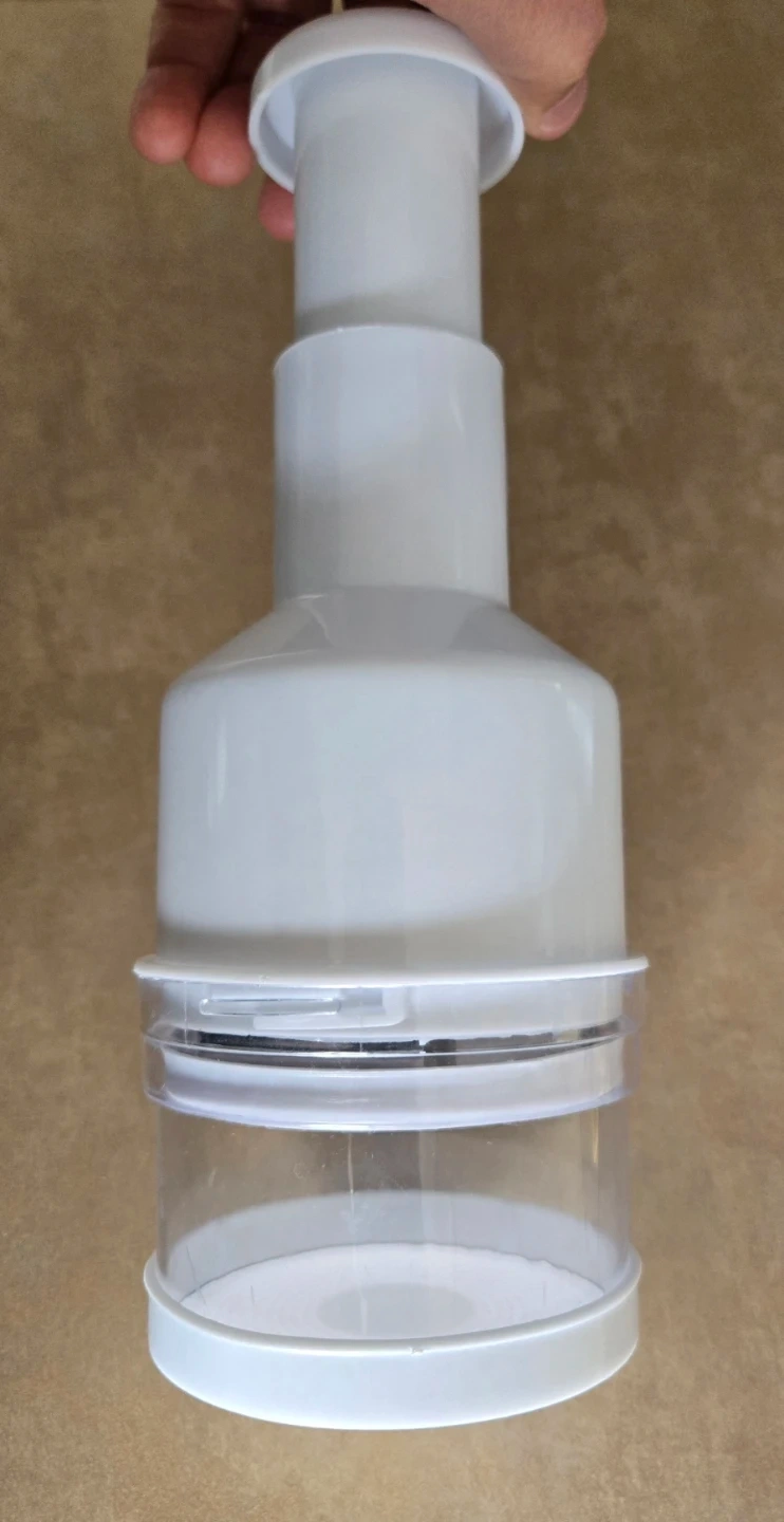 This white manual food chopper is designed for quick dicing. It includes a base and a clear collection container. This kitchen tool is handy for preparing ingredients efficiently! Used only once. Selling as I don't use it enough and decluttering. Cash only. Pick up Signal Hill.