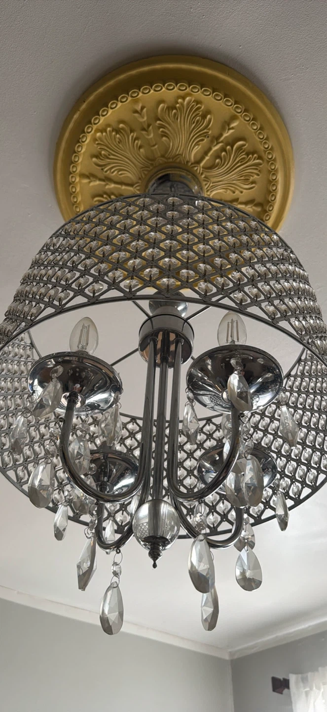 This elegant drum chandelier features a diamond lattice pattern with sparkling crystal accents. It has four light sockets and decorative crystal drops for added flair. The metal finish is a dark gray, complementing the silver-toned crystals. Adds a touch of glamour to any room!