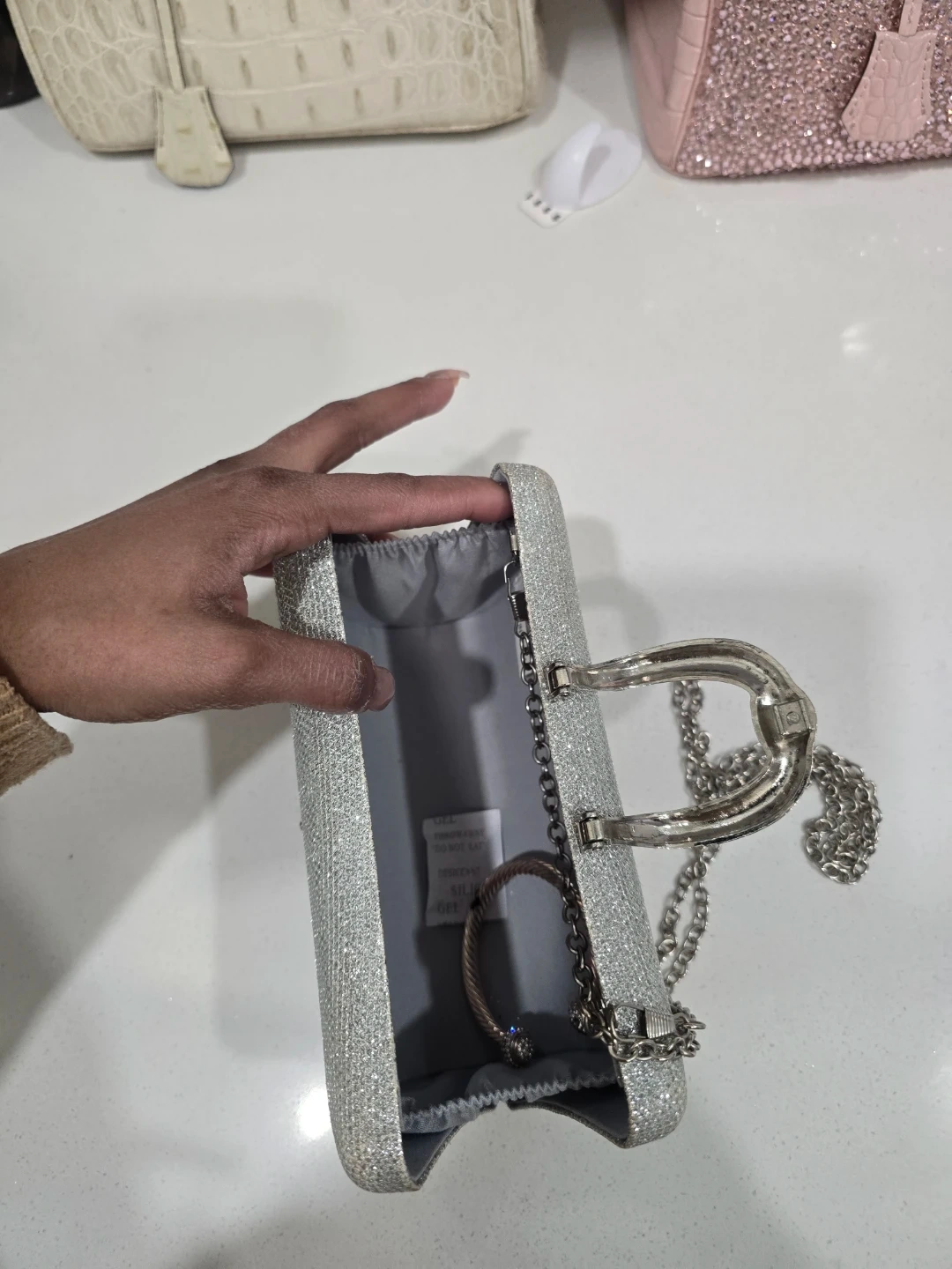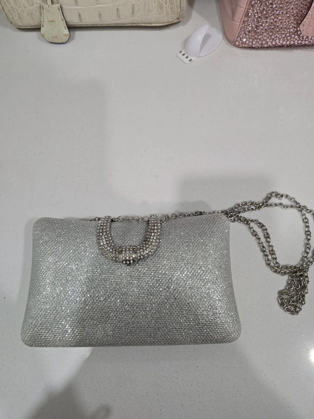 This sparkling silver clutch is perfect for any special occasion. It features a glitter exterior and a secure clasp closure. Includes a detachable silver chain strap.Firm on price and will not accept lowballs.