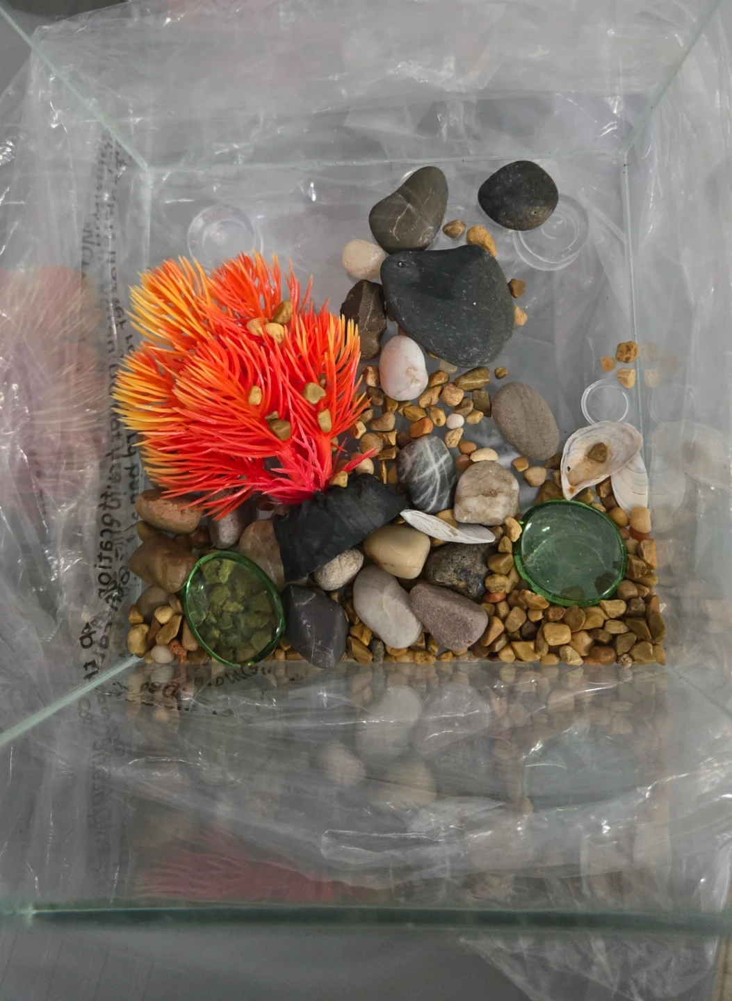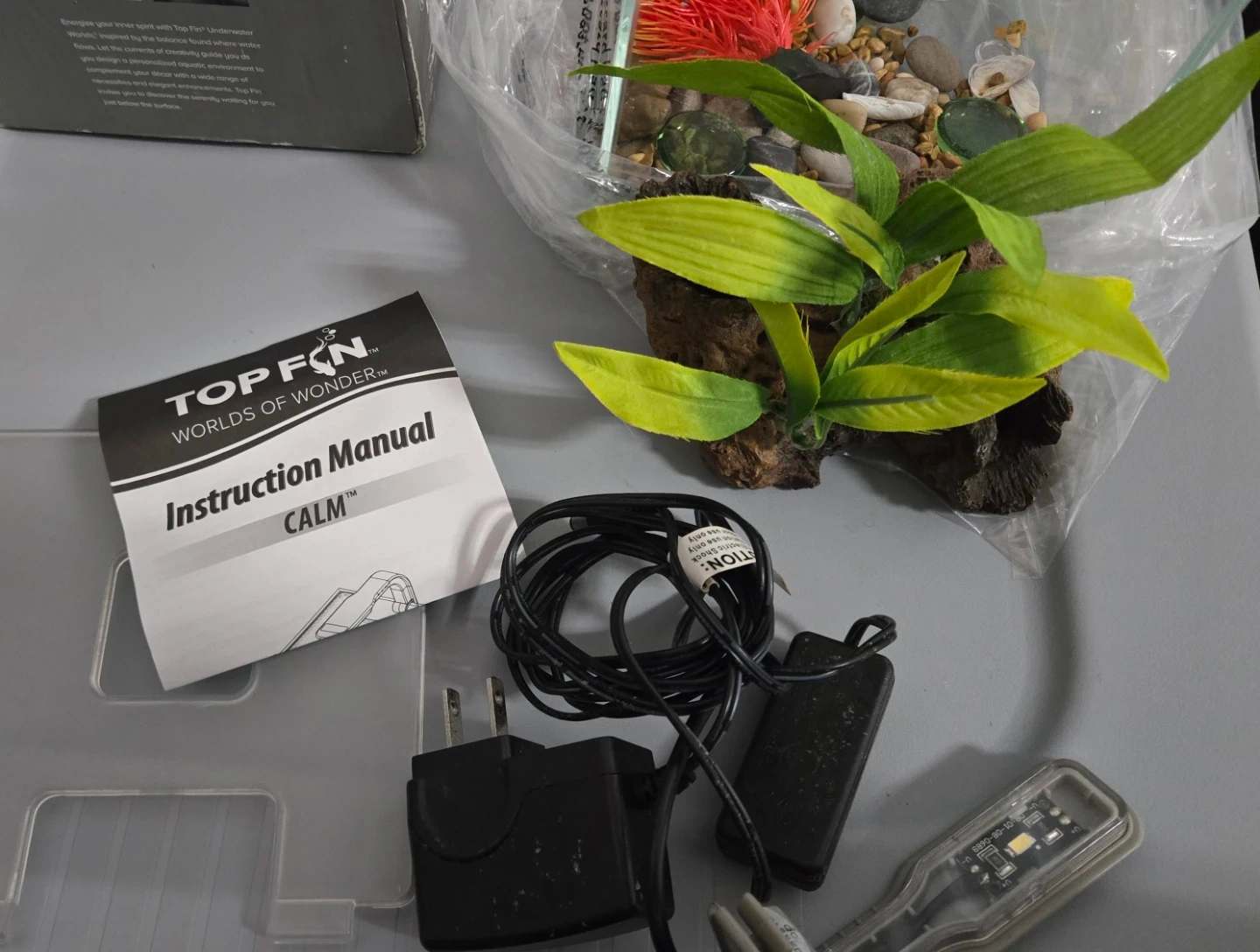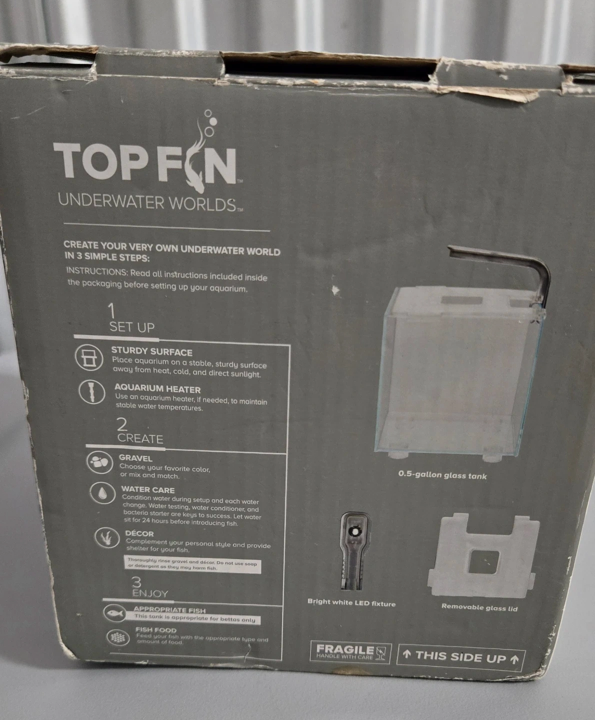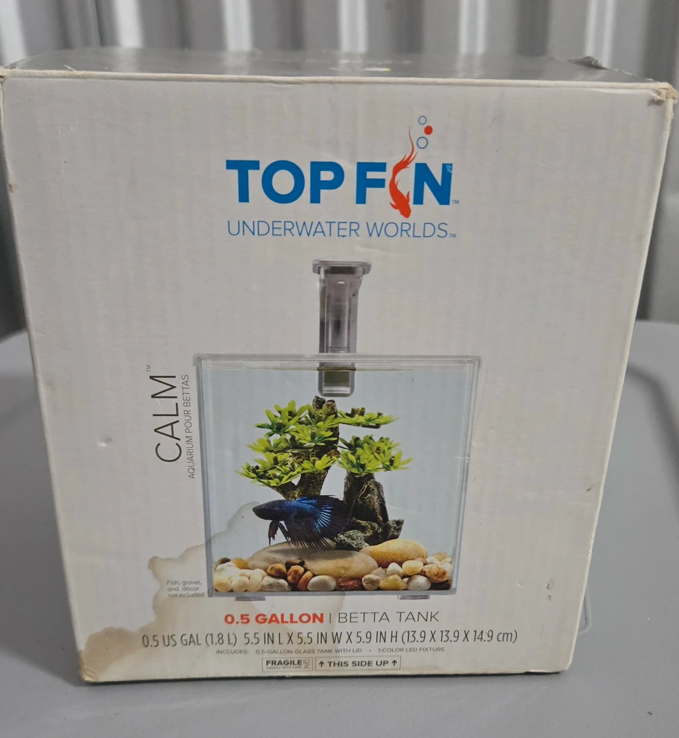 This pre-owned Top Fin Calm aquarium is a 0.5-gallon glass tank designed for bettas. It includes fish gravel, decor, a removable plastic lid, and a LED fixture. The kit is perfect for creating a small underwater world for beta or small goldfish.