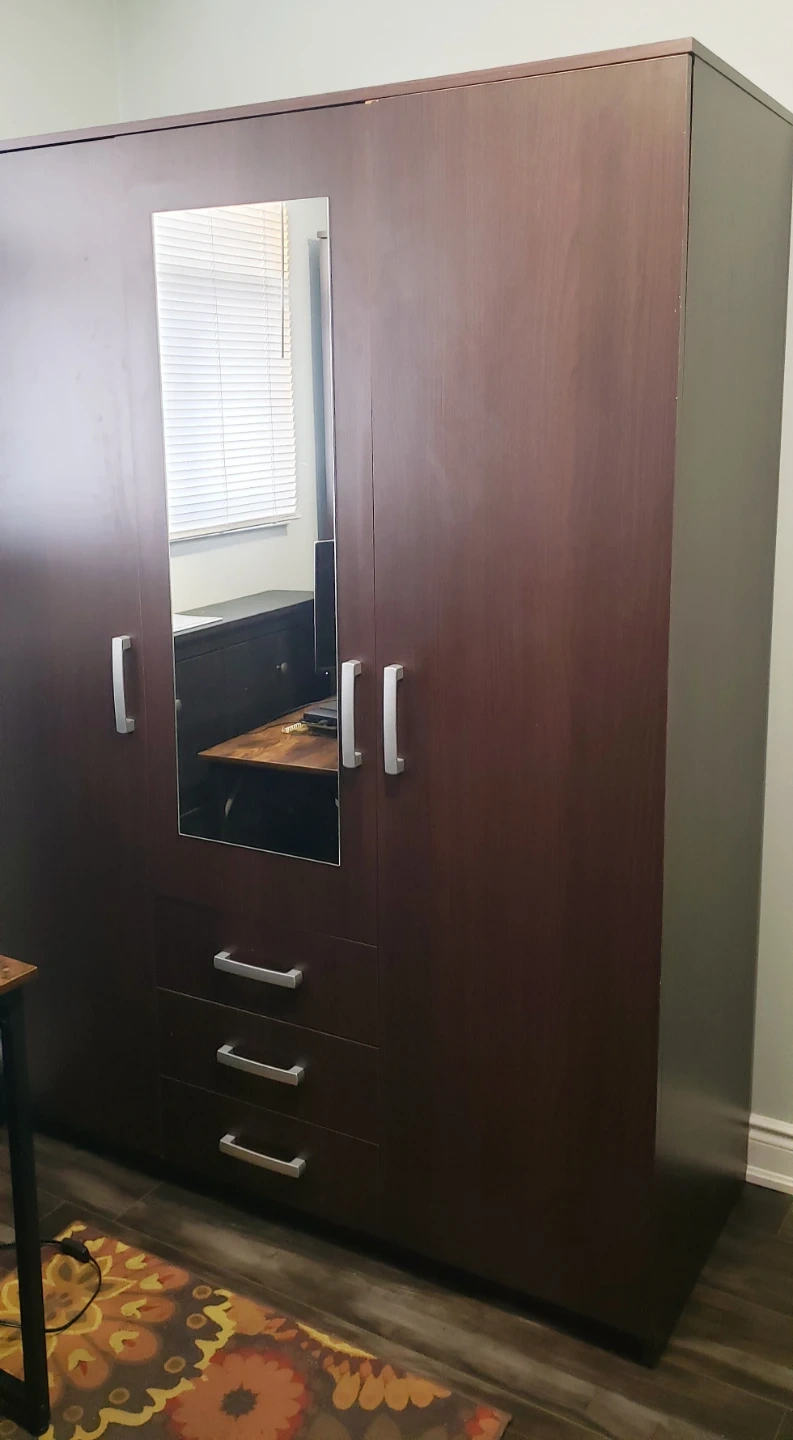Two (2) Dark brown wardrobes with a full-length mirror on one door. They have, three cabinet doors and three built-in drawers at the bottom for extra storage. This simple design fits well in most bedrooms.