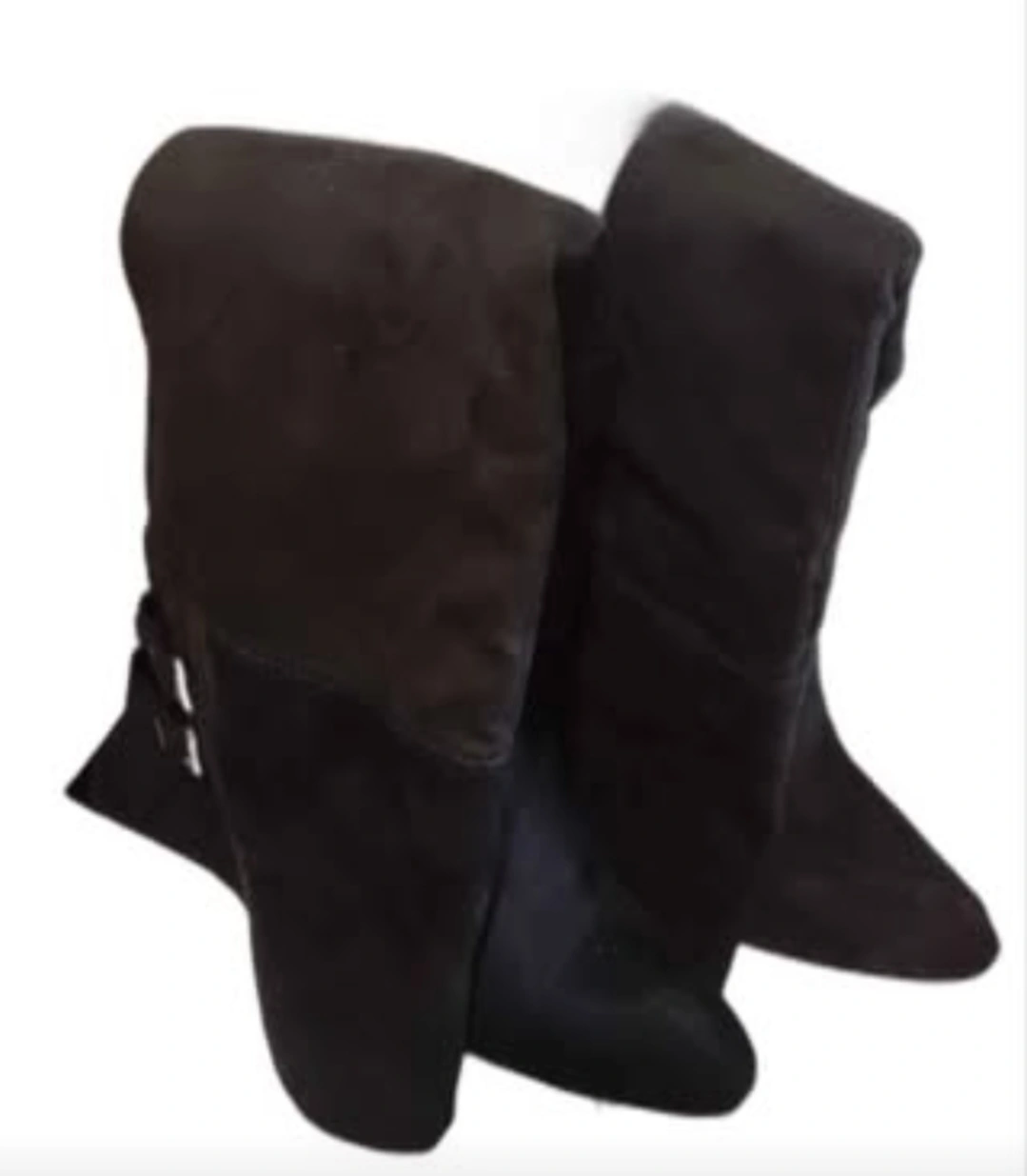 Pair of black suede over-the-knee boots. Features a block heel and side zipper. Buckle detail at the top of the shaft. Excellent for fall and winter.