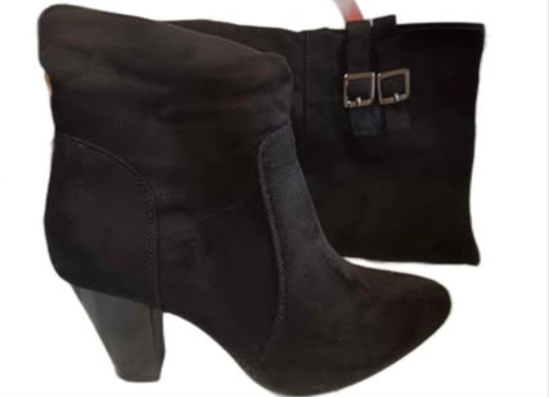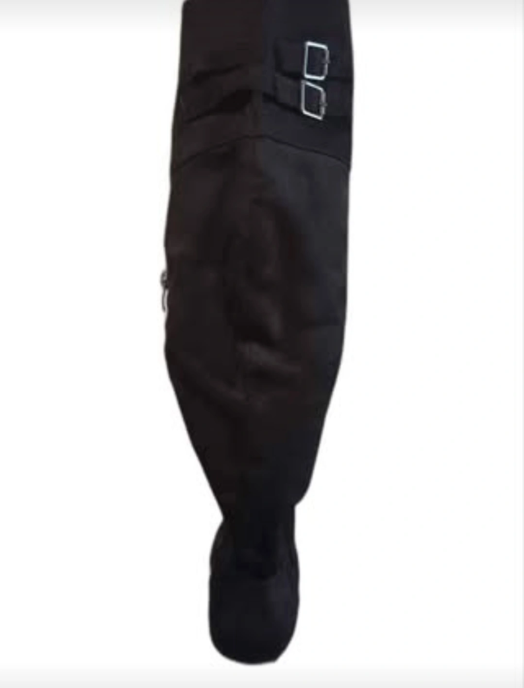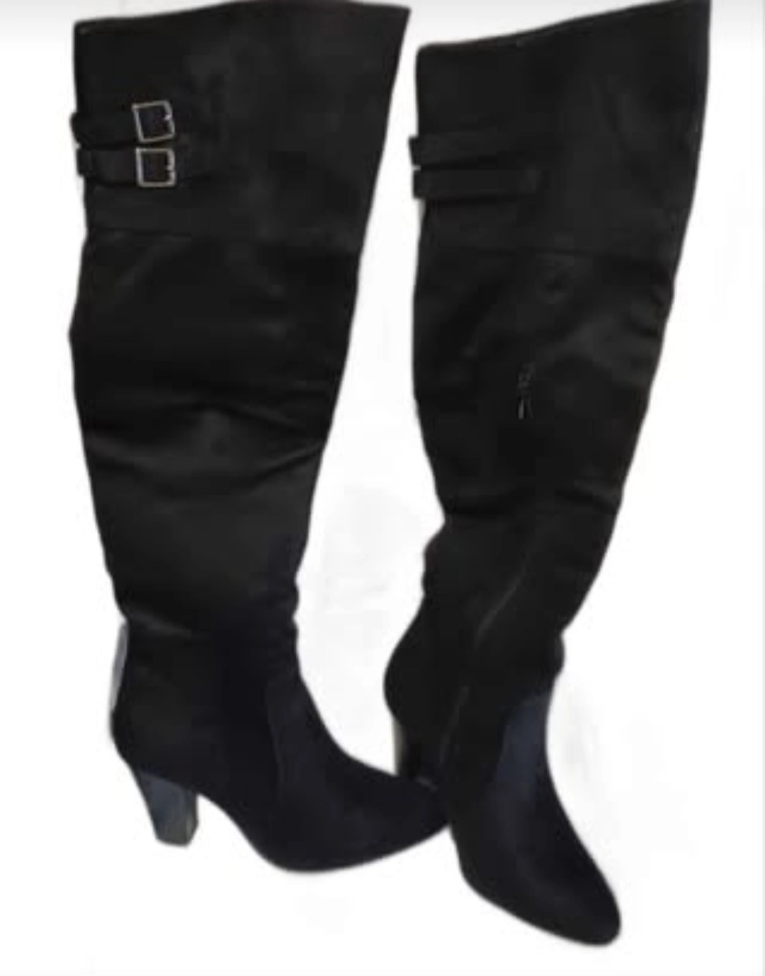 Pair of black suede over-the-knee boots. Features a block heel and side zipper. Buckle detail at the top of the shaft. Excellent for fall and winter.