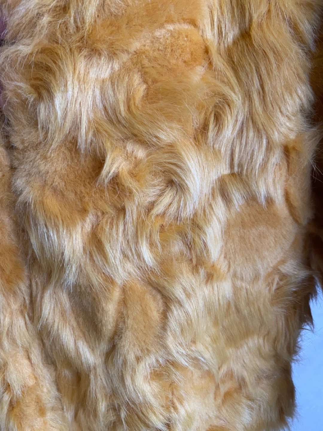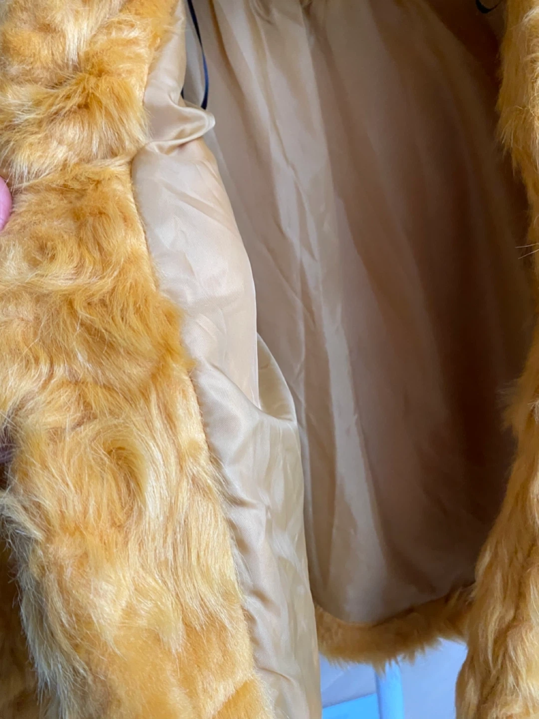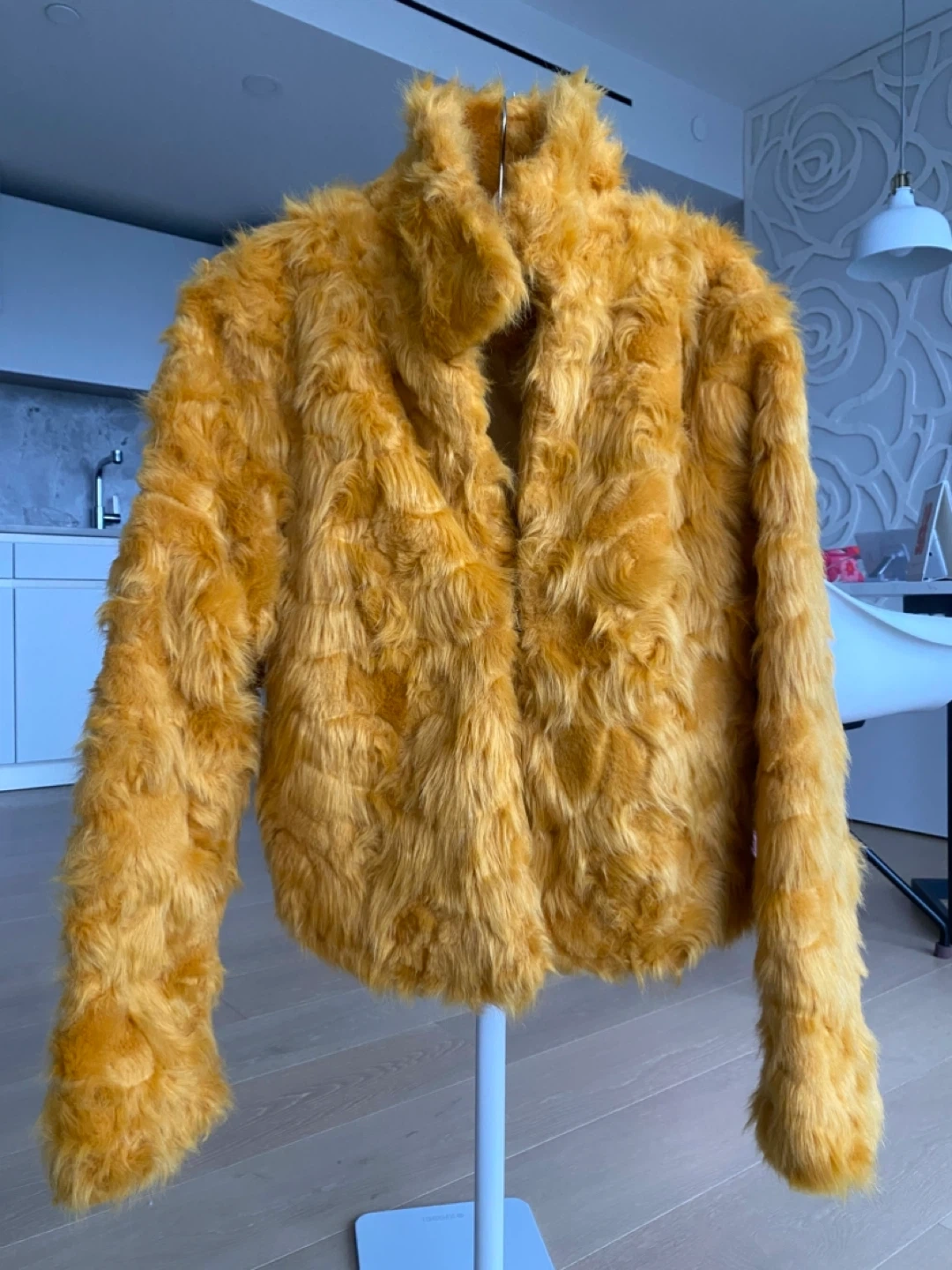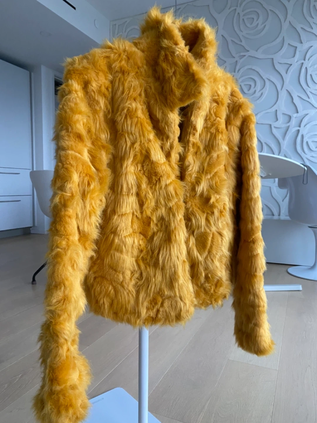 Snuggle up in this cozy faux fur jacket! It's a vibrant mustard yellow colour and perfect for adding a touch of warmth and style to any outfit. Great for layering on those chilly days!