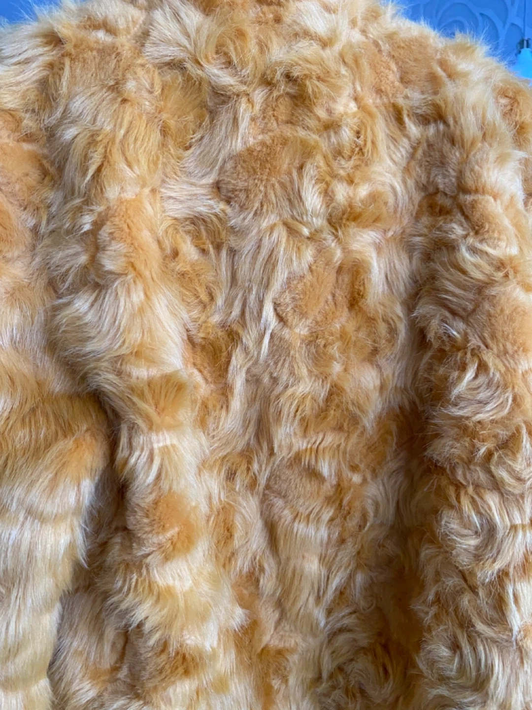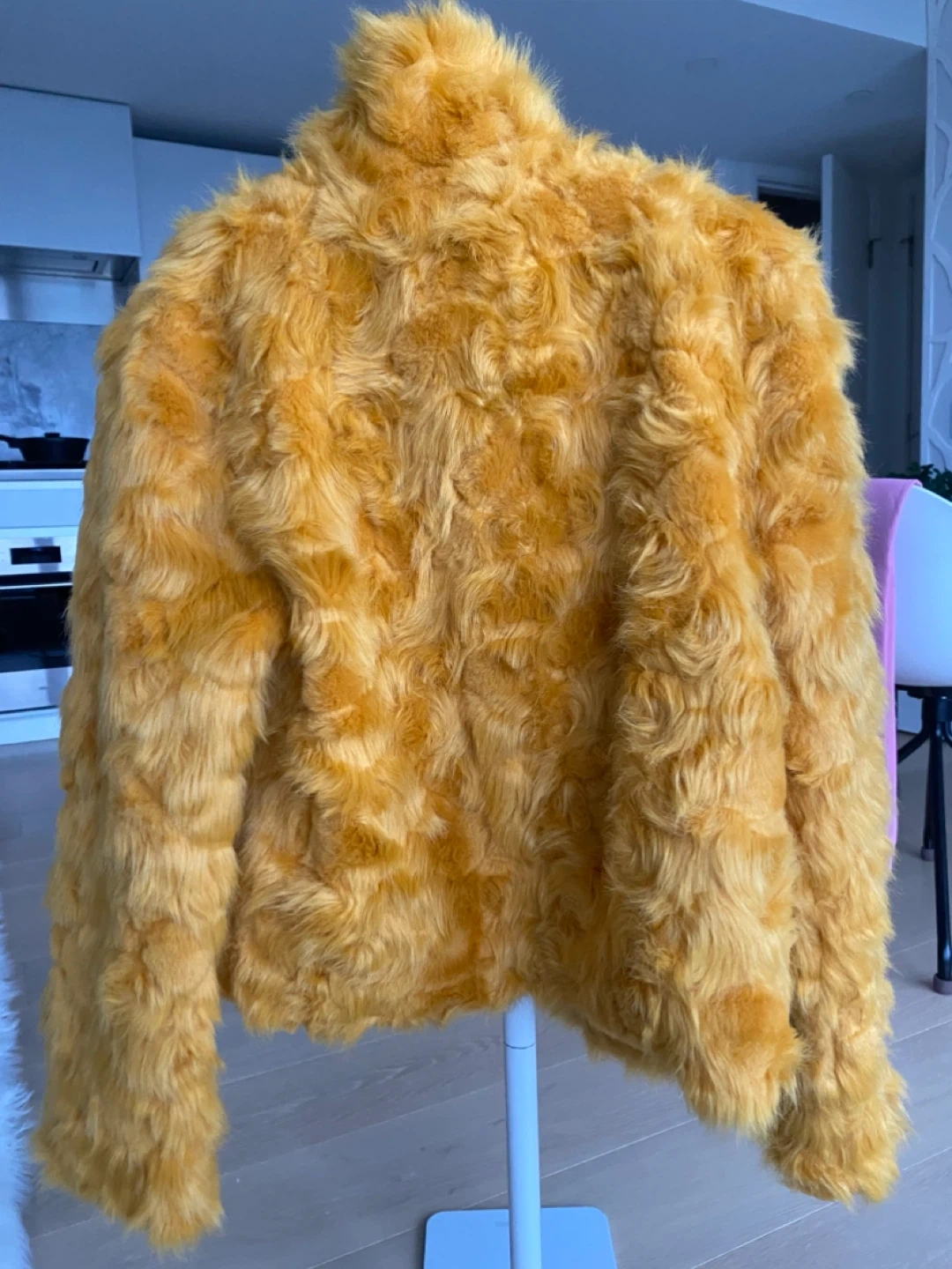 Snuggle up in this cozy faux fur jacket! It's a vibrant mustard yellow colour and perfect for adding a touch of warmth and style to any outfit. Great for layering on those chilly days!
