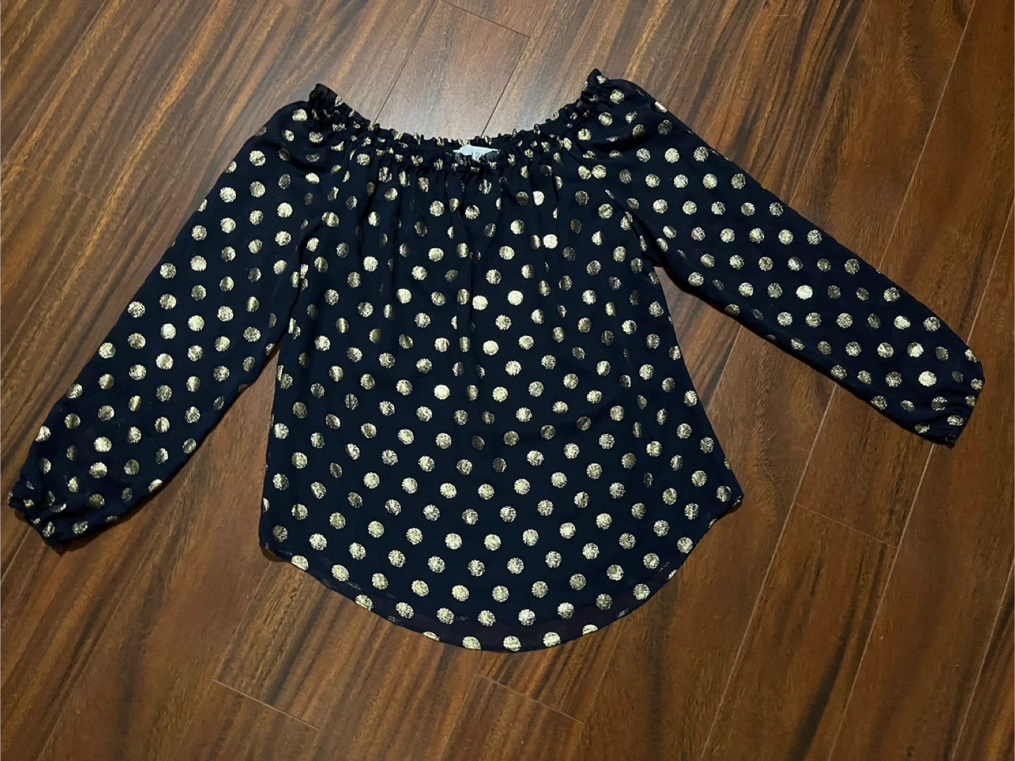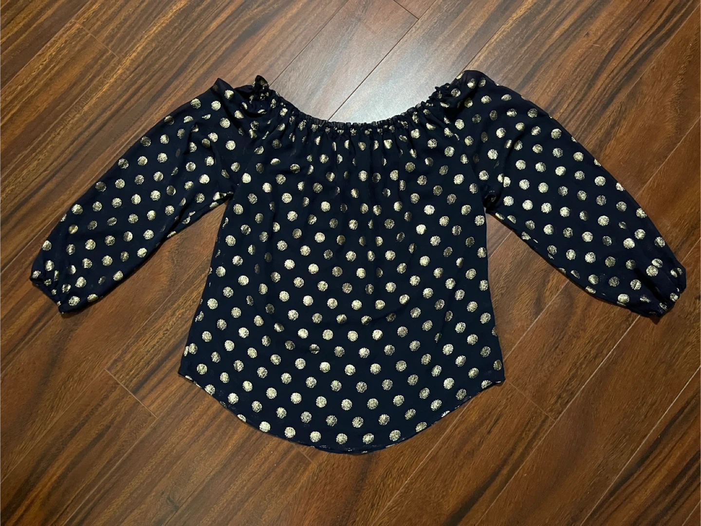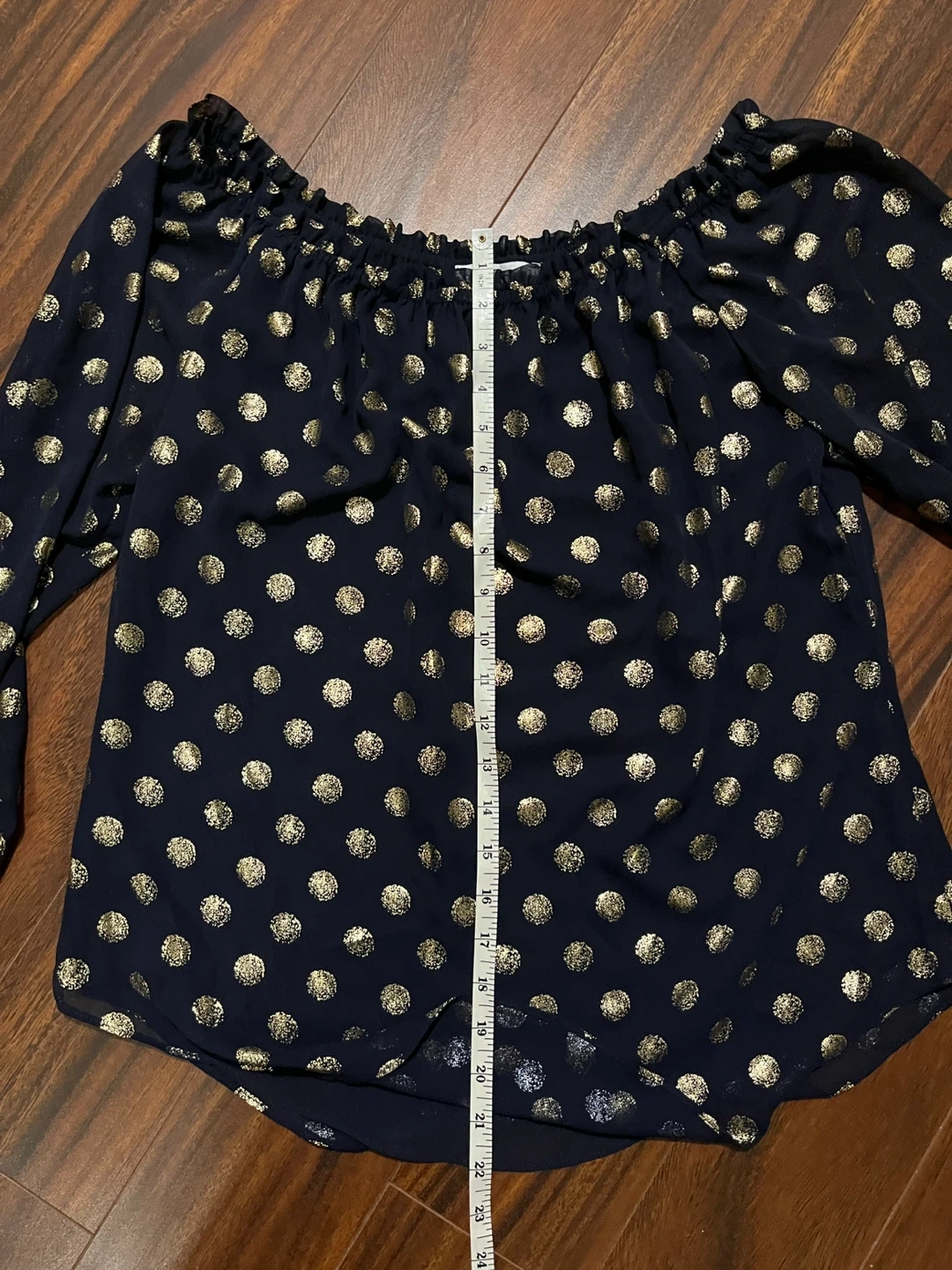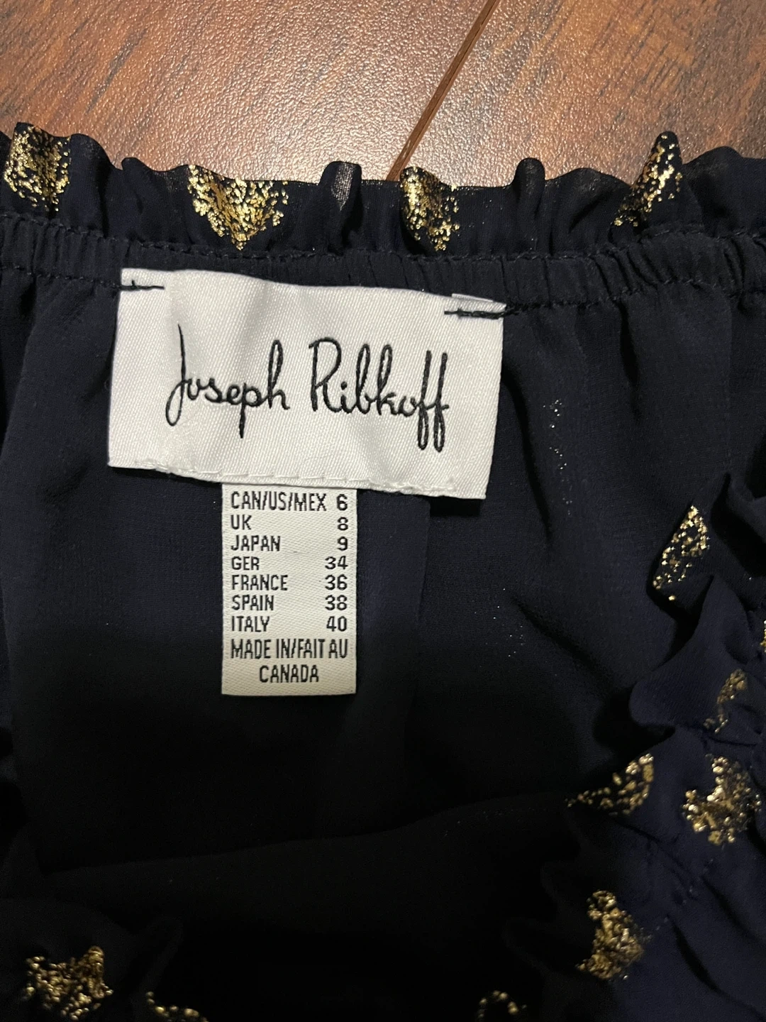 Authentic Joseph Ribkoff women’s blouse in midnight blue with gold polka dots. New without tags! Elasticized ruffle neckline allows off-the-shoulder wear. Semi-sheer fabric with curved hem and long blouson sleeves. Made in Canada. Generous size six fit.