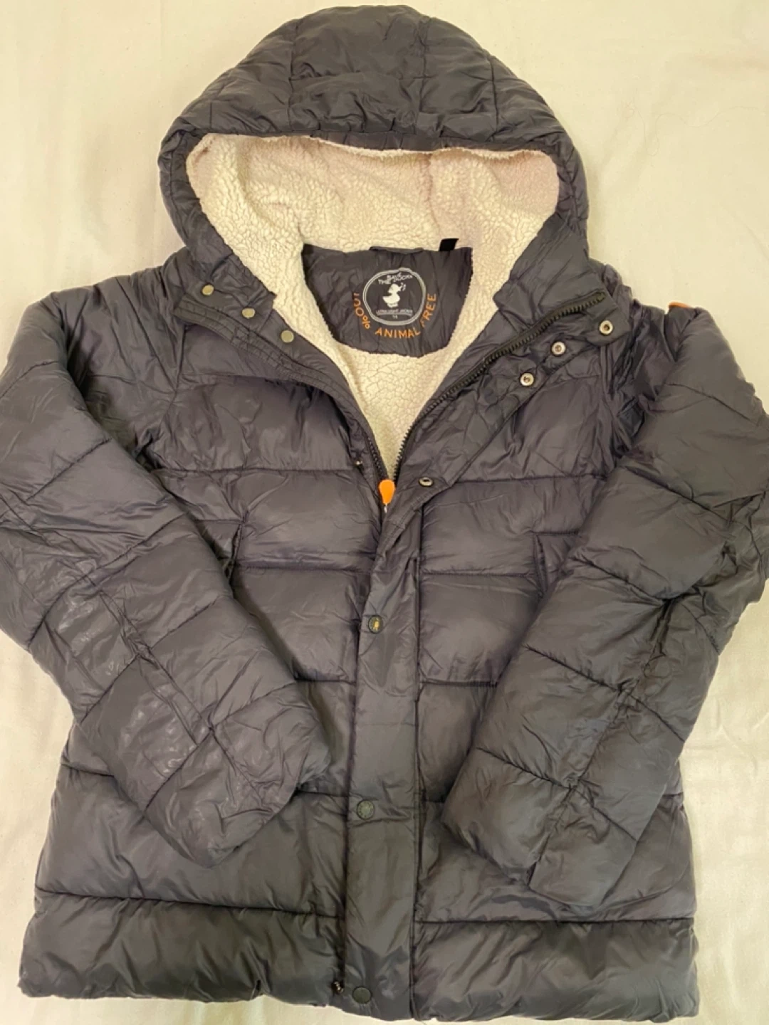 This Save The Duck puffer jacket is in Navy colours. It's a size for 14Yr Girls and features a cozy sherpa-like lining. The outer shell is 100% nylon, and the lining is made of 100% recycled polyester fibres, making it a sustainable choice. Perfect for staying warm and stylish during the colder months!