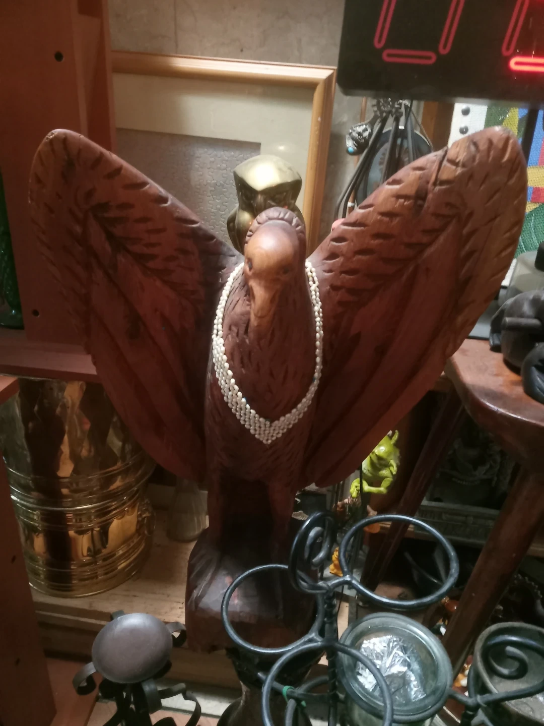 Hand-Carved Wooden Eagle Figurine with Pearl Necklace