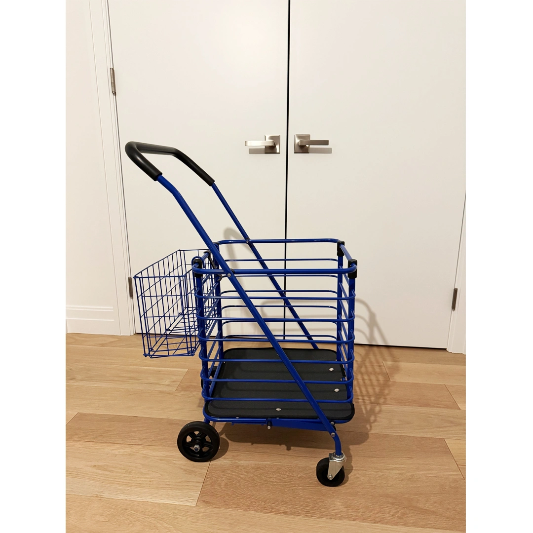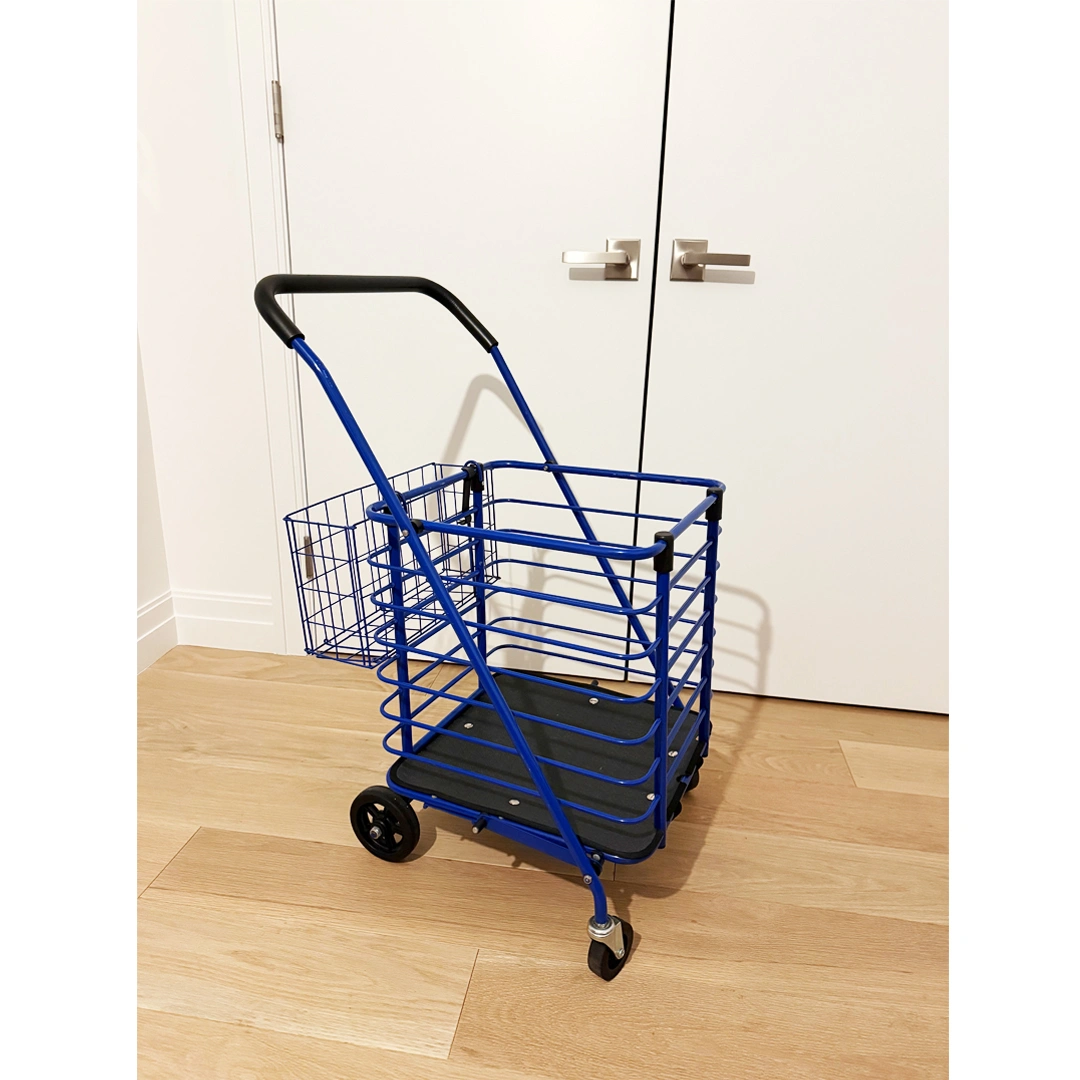 The Blue Grocery Cart with Accessory Basket is a multi-use cart great for grocery, laundry, shopping and other uses. It will hold up to 50 lbs. The accessory basket allows you to separate items from the cart as needed and is detachable. Easily folds up for compact storage.