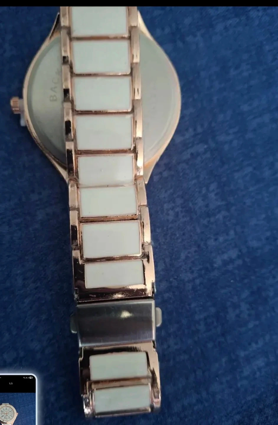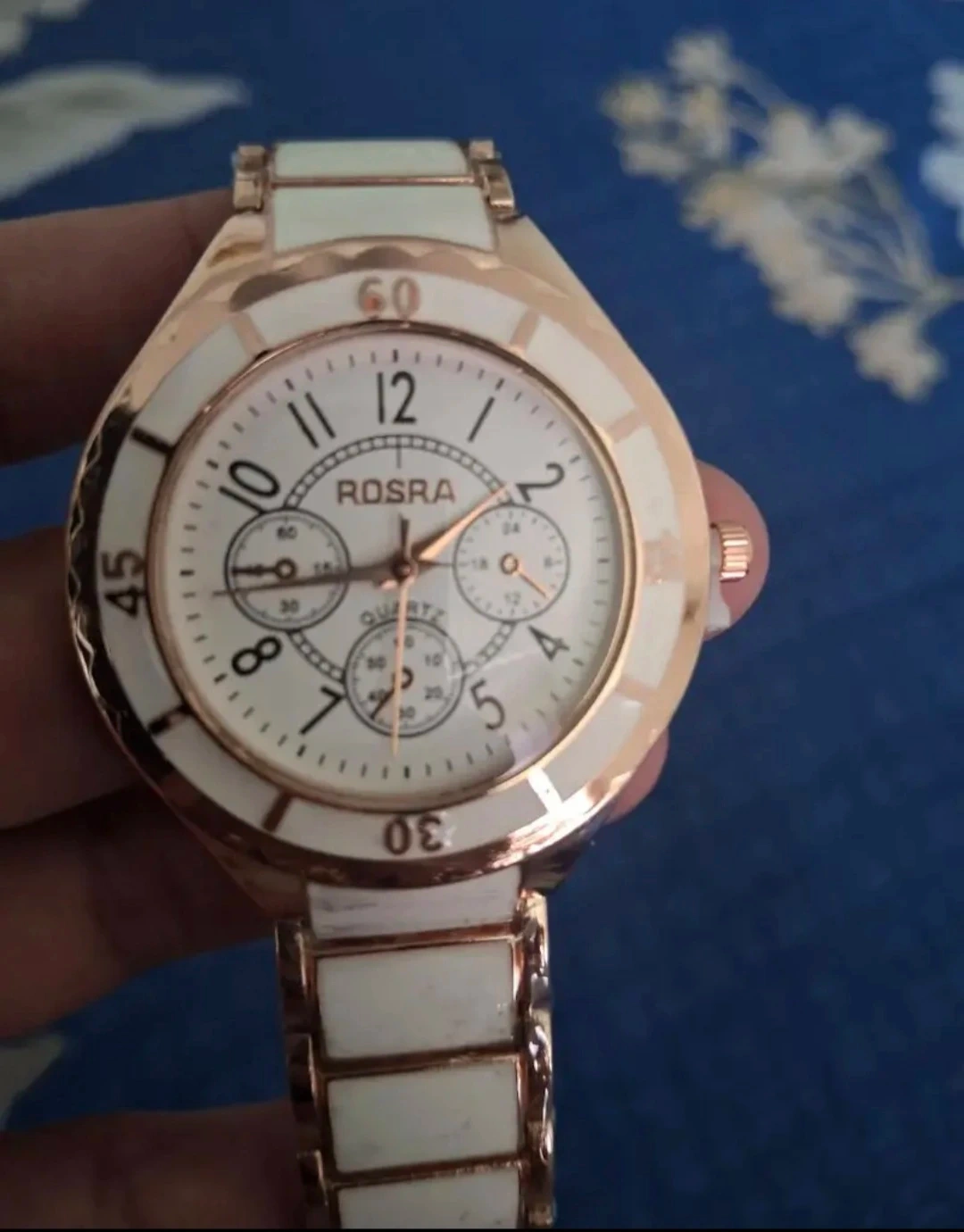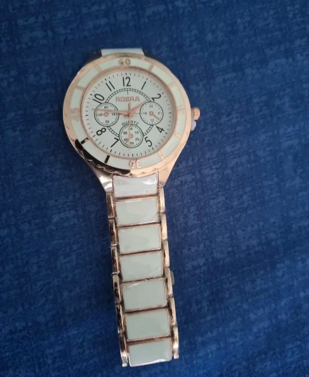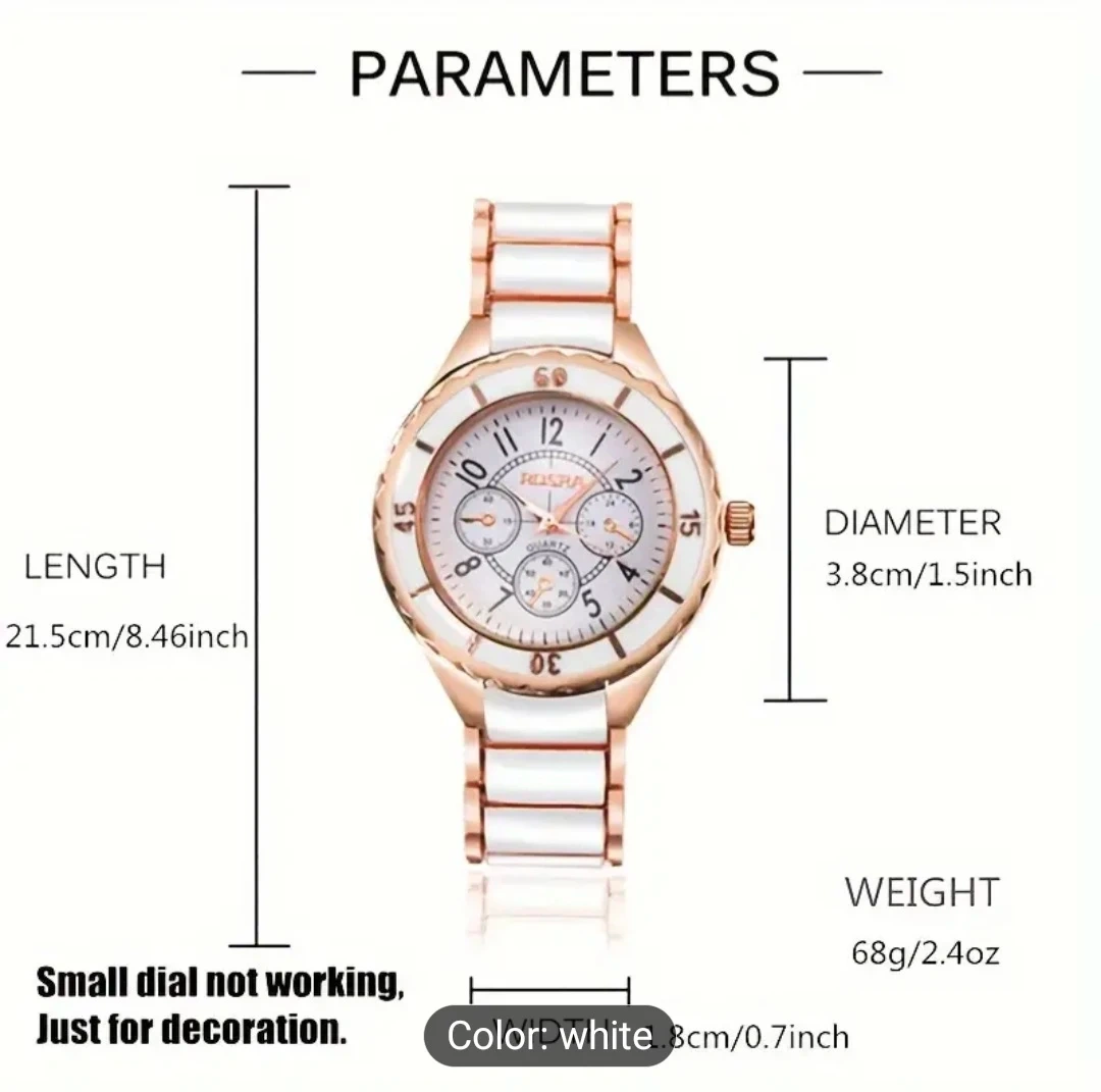 ROSDRA quartz watch with a white and rose gold design. Features a 3.8cm/1.5inch diameter face and a 21.5cm/8.46inch length band. Small dial is for decoration only. The watch weighs 68g/2.4oz.