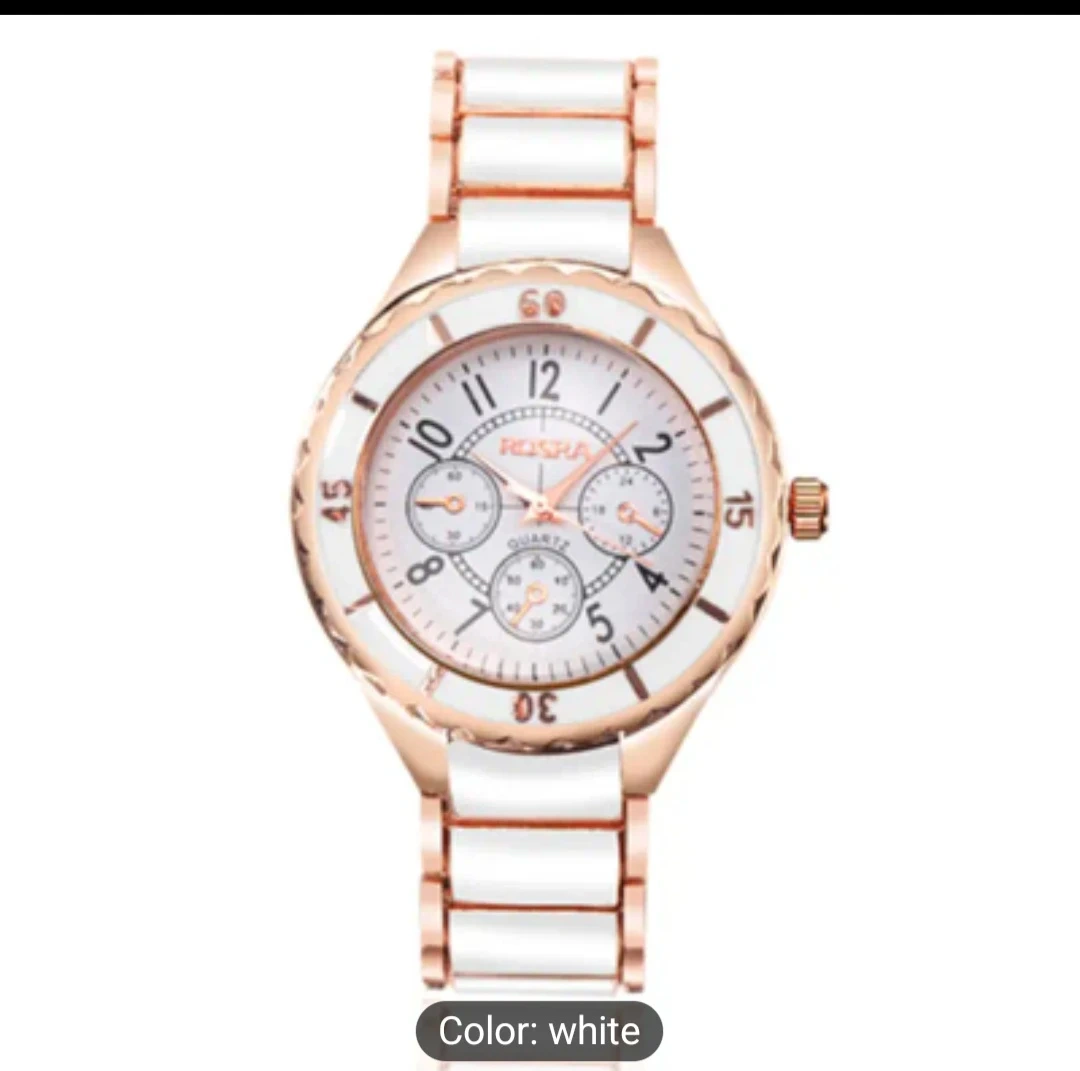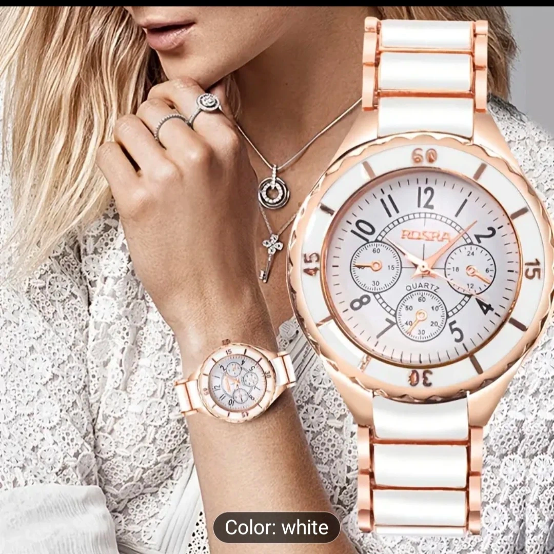 ROSDRA quartz watch with a white and rose gold design. Features a 3.8cm/1.5inch diameter face and a 21.5cm/8.46inch length band. Small dial is for decoration only. The watch weighs 68g/2.4oz.