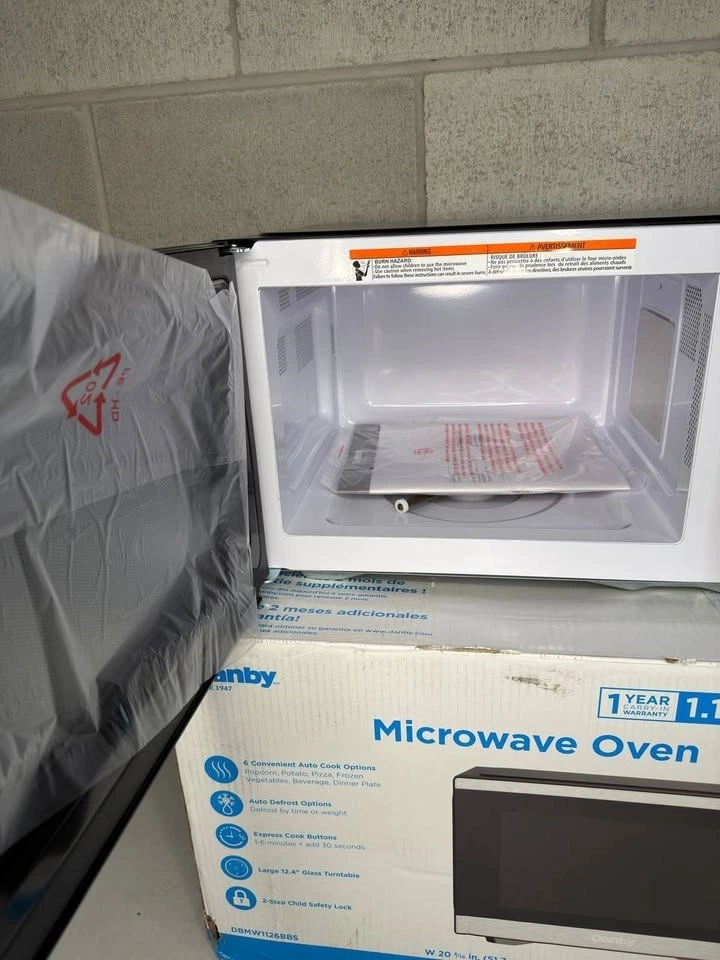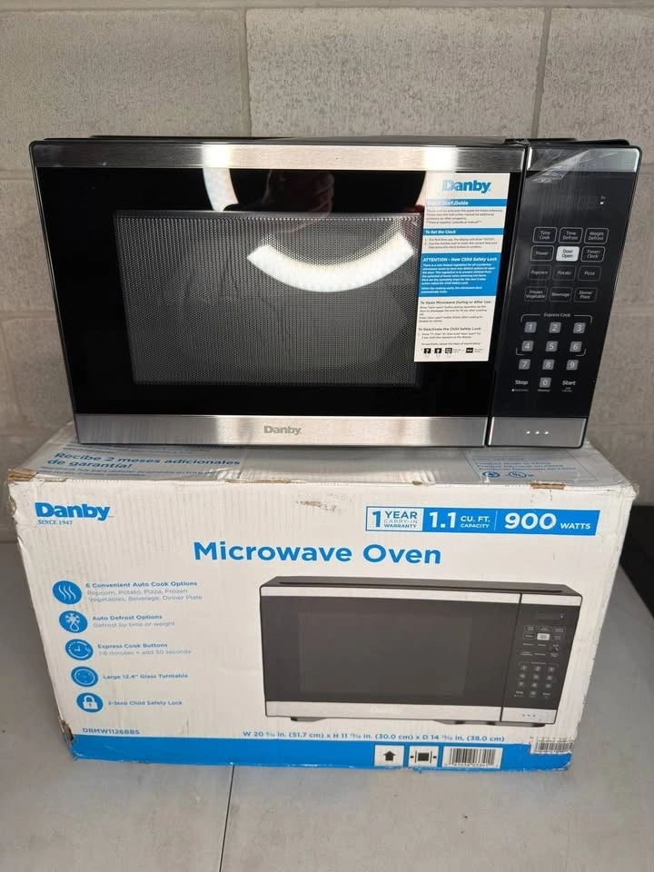 Danby 1.1 cu. ft. countertop microwave offers 900W power with 10 adjustable levels for everyday cooking and reheating. Measuring 38 Γ 51.7 Γ 30 cm, it features six one-touch auto-cook presets, express cook options, defrost functions, and a sleek stainless steel finish ideal for kitchens, condos, or offices.