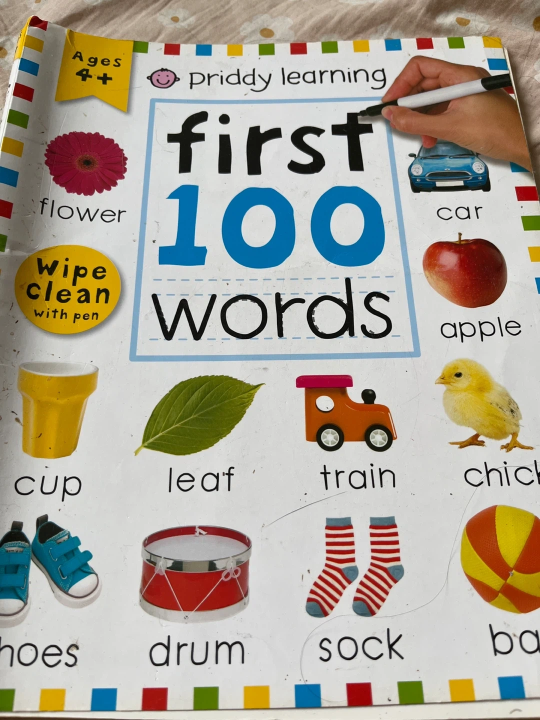 This Priddy Learning book is for ages 4+. It's a wipe-clean activity book designed to help young children learn their first 100 words. It includes various images and words for practice.