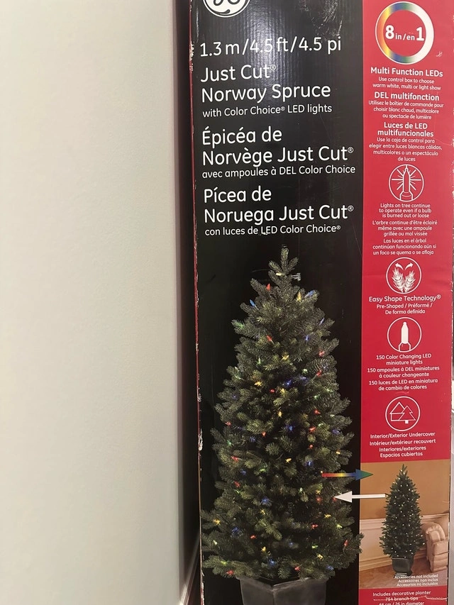 Create a festive ambiance with this Norway Spruce Just Cut 4.5-foot artificial Christmas tree. It features colour choice LED lights, easy shape pre-shaped construction, and a sturdy decorative pot. The tree is in used but great condition, ready to brighten up your holiday season!