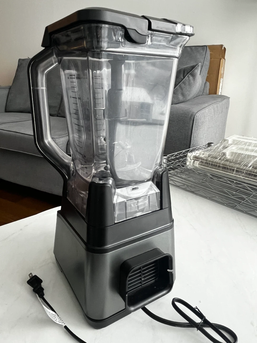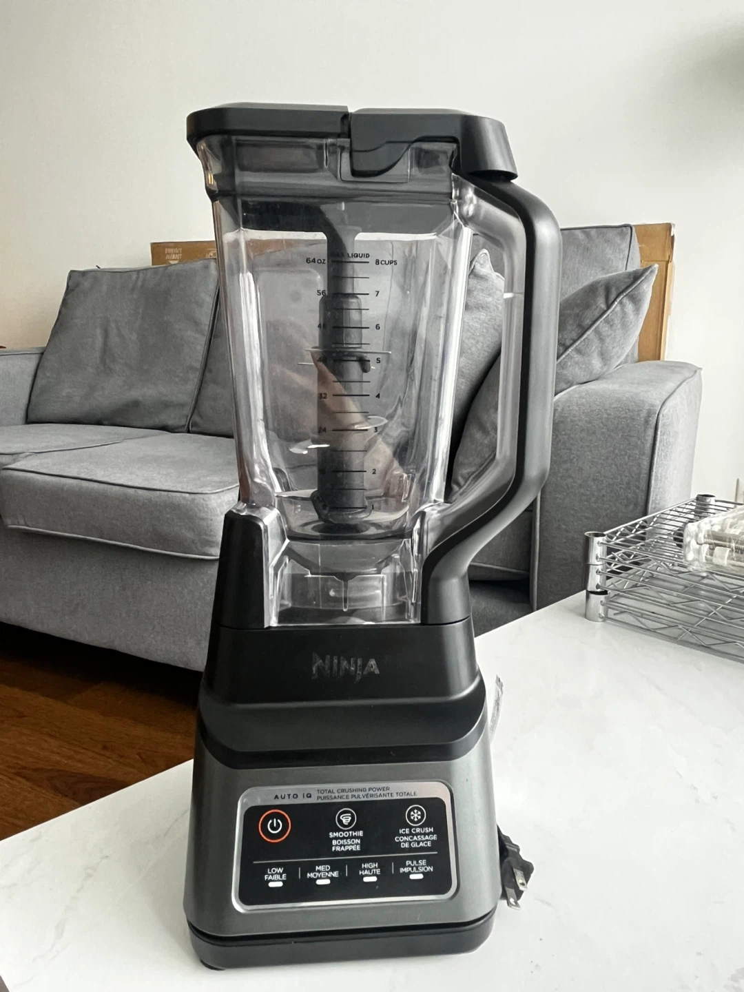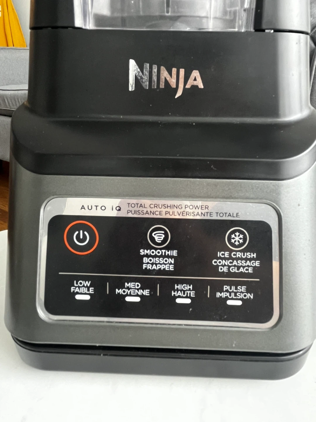 This is a Ninja blender with Auto-IQ technology. It offers total crushing power for smoothies and ice crush settings. Low, medium, and high speed options are available, along with a pulse function.
