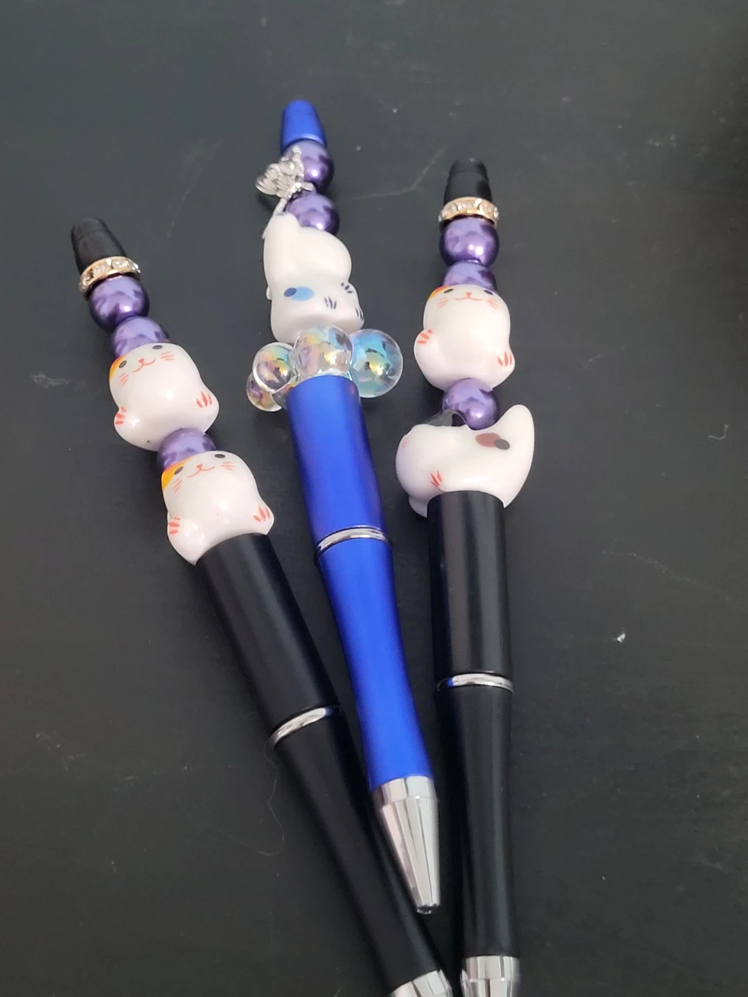 These three pens are decorated with charming Maneki-neko cat charms and beads. They have black and blue barrels with silver accents. They're great for anyone who loves cats or wants to add a touch of cuteness to their stationery collection!