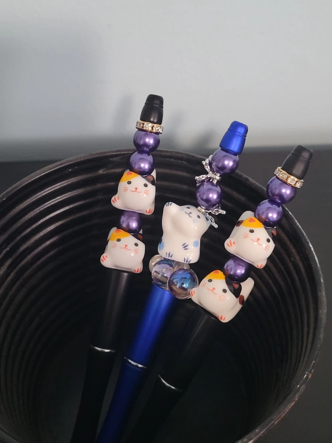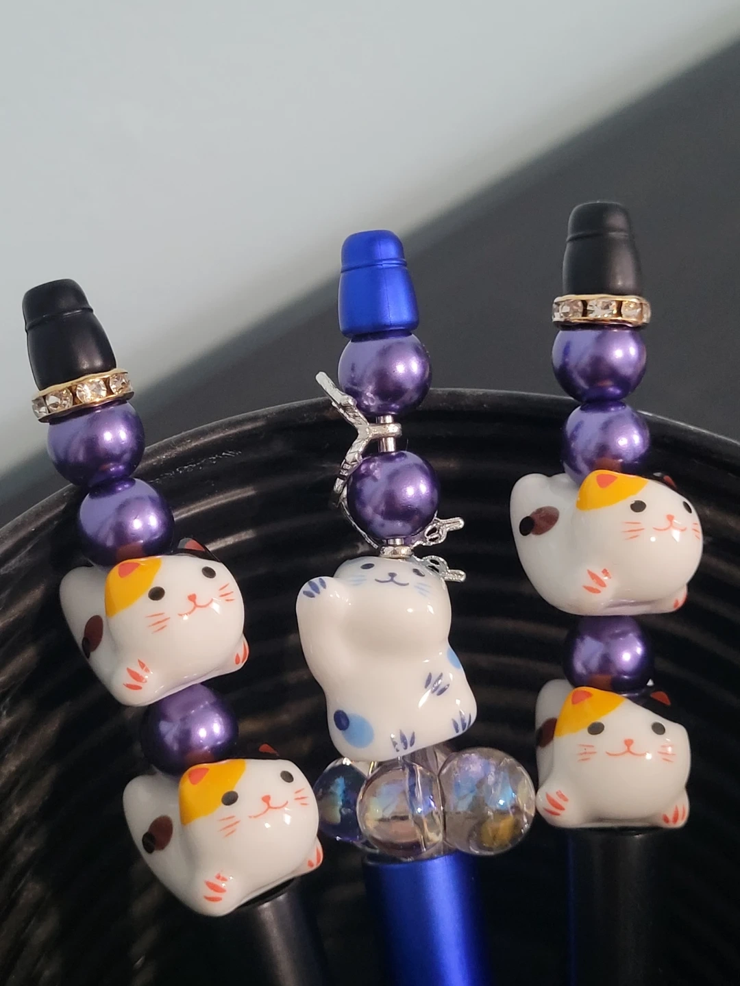 These three pens are decorated with charming Maneki-neko cat charms and beads. They have black and blue barrels with silver accents. They're great for anyone who loves cats or wants to add a touch of cuteness to their stationery collection!
