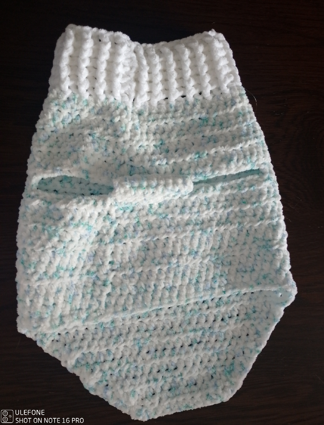Selling a cute, handmade dog sweater in white and blue. It's in great condition and would be perfect for keeping your furry friend warm during the cooler months!