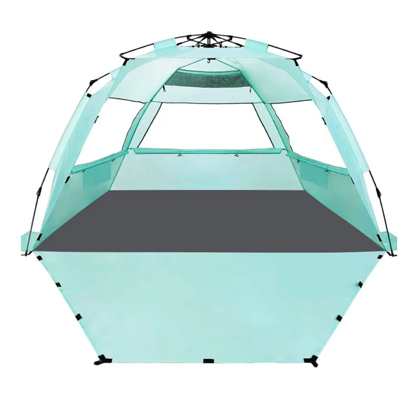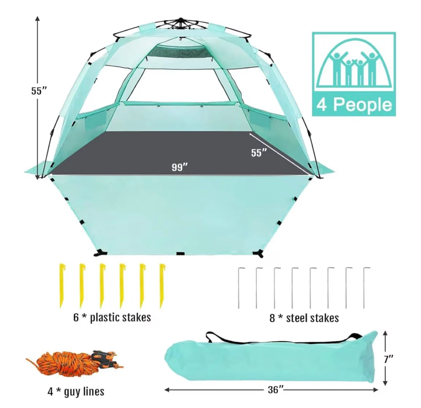 This light blue beach tent comfortably fits 4 people. It's easy to set up in seconds and has a 99" x 55" floor. Comes with 6 plastic stakes, 8 steel stakes, and 4 guy lines for secure setup.