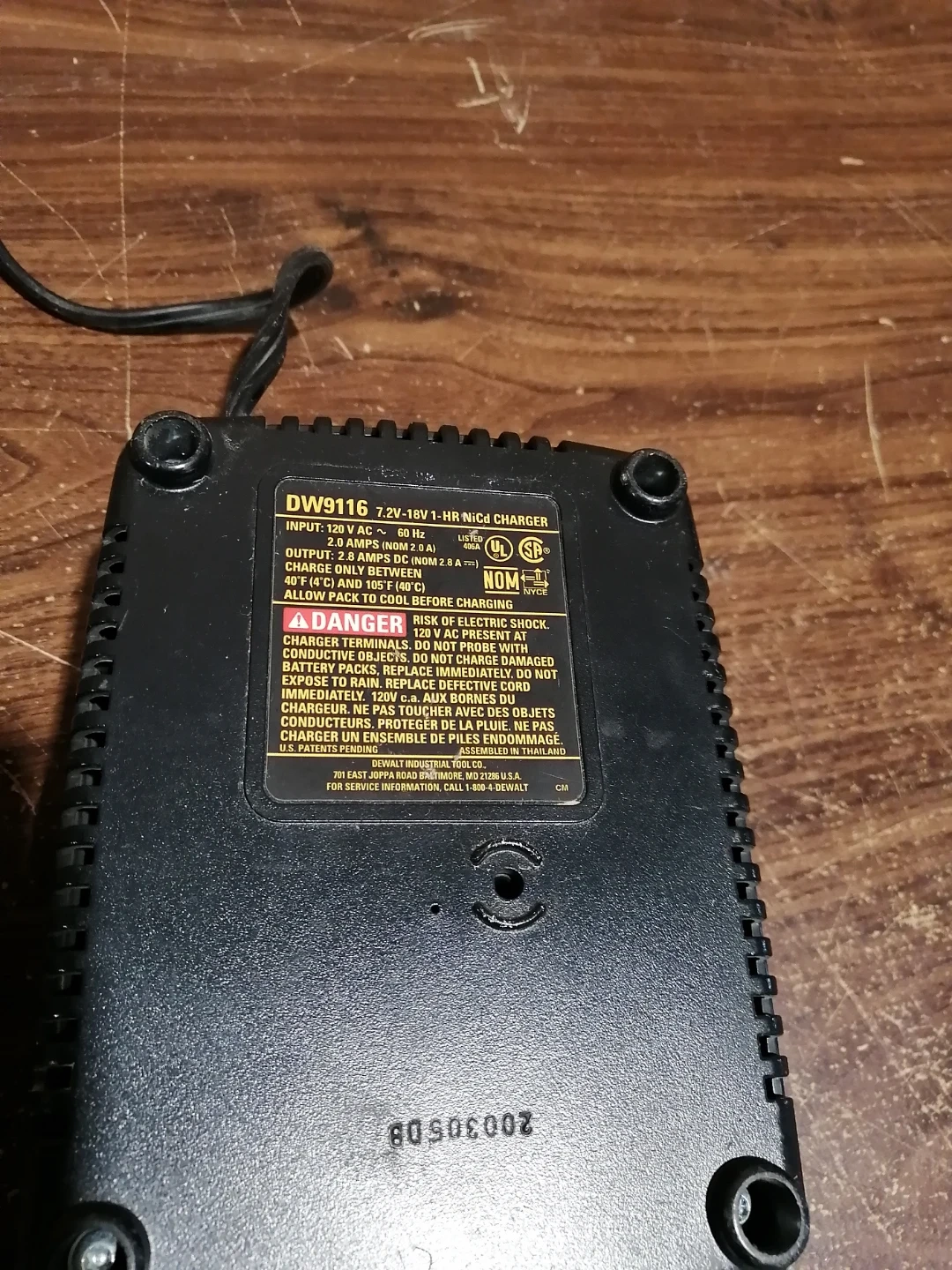 DeWalt DW9116 1-hour NiCd battery charger for 7.2V to 18V batteries. It features automatic turn mode for longer battery life. This charger is assembled in Thailand. Call Anthony