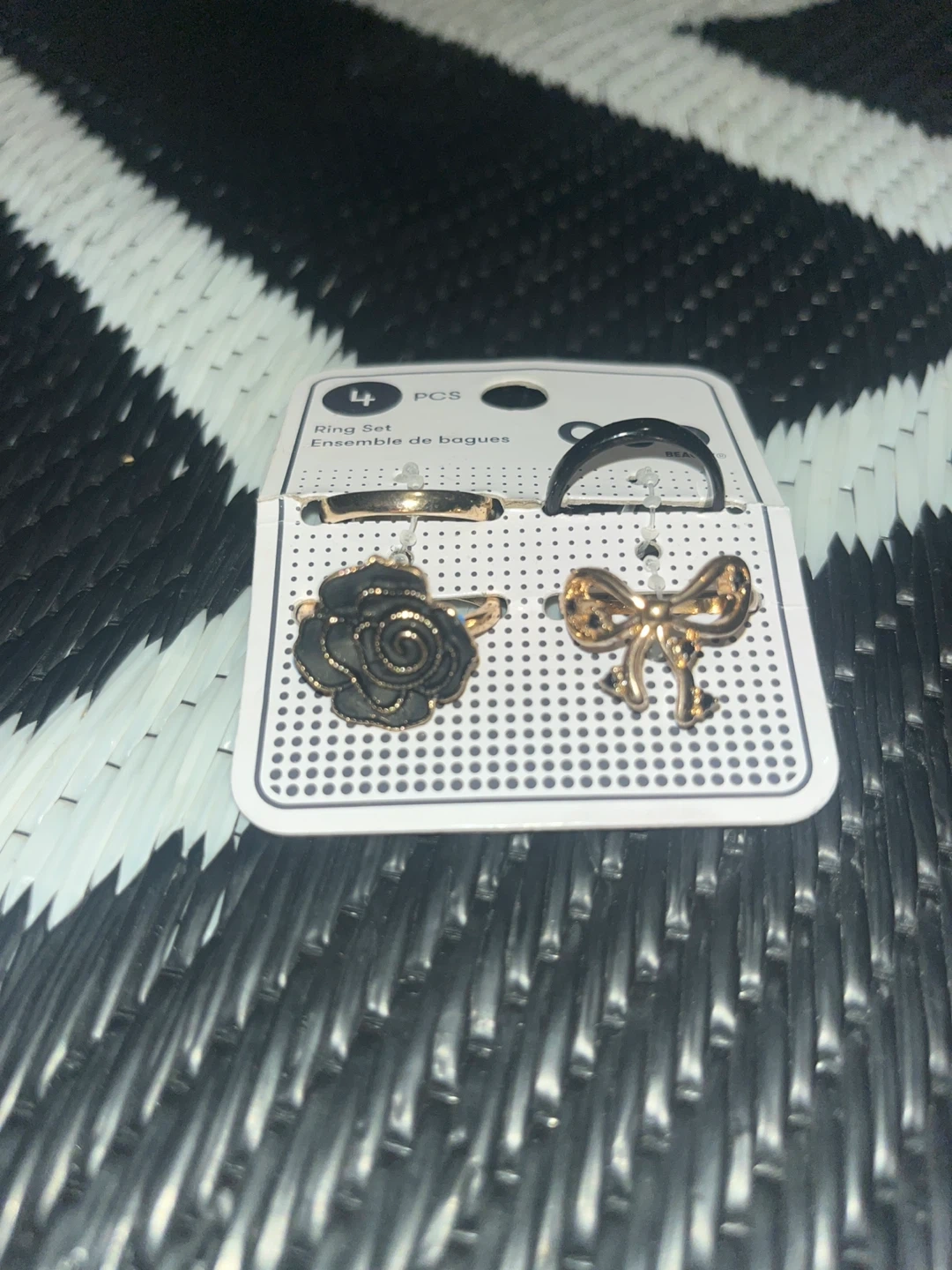 This is a 4-piece ring set from QUO Beauty. It includes two plain bands and two decorative rings, one with a rose design and another with a bow. These rings are great for adding a touch of style to any outfit!