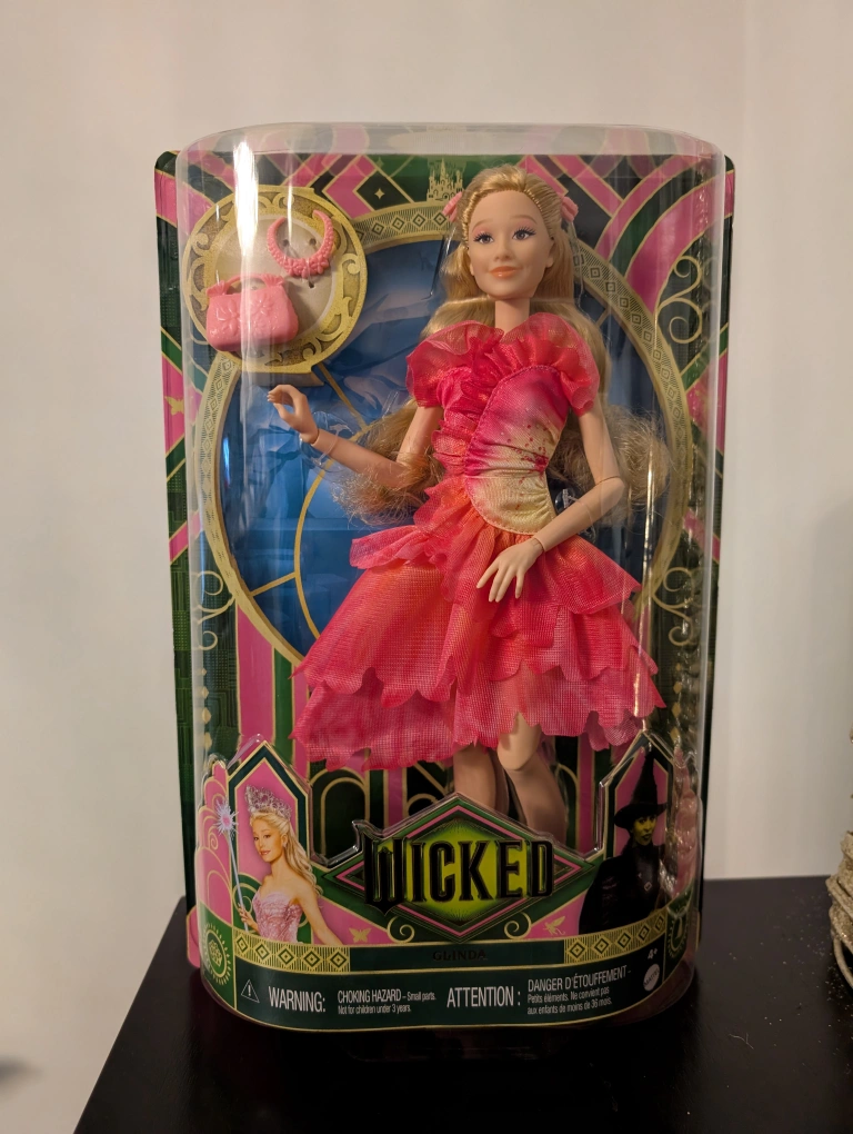 Wicked the movie. Glinda doll in pink party dress, comes with purse. Mattel brand.