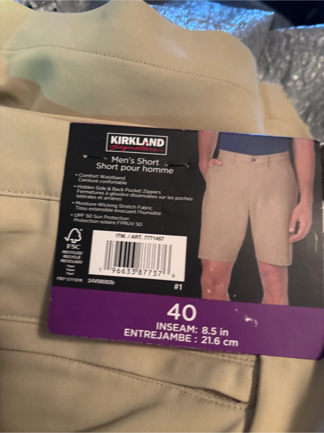 These Kirkland Signature men's shorts are in great condition and ready for a new home! They're a size 40 and feature a comfort waistband, hidden side & back pocket zippers, moisture-wicking stretch fabric, and UPF 50+ sun protection