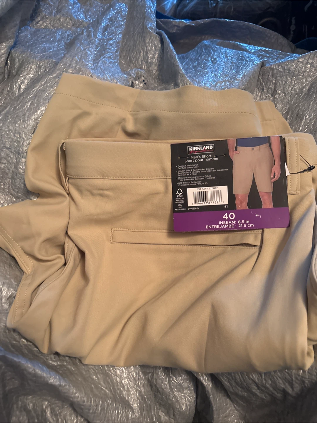 These Kirkland Signature men's shorts are in great condition and ready for a new home! They're a size 40 and feature a comfort waistband, hidden side & back pocket zippers, moisture-wicking stretch fabric, and UPF 50+ sun protection