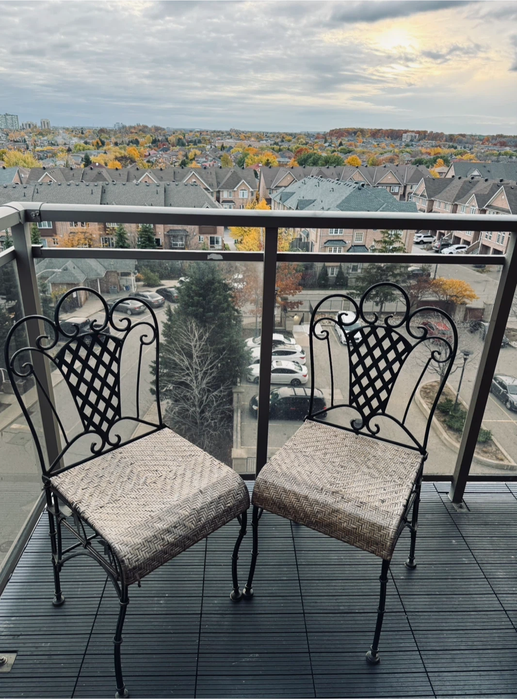 Selling a set of two outdoor wrought iron chairs! They're perfect for a balcony or small patio. The chairs have a lovely woven seat and a decorative wrought iron frame. They're in great condition and ready for a new home!