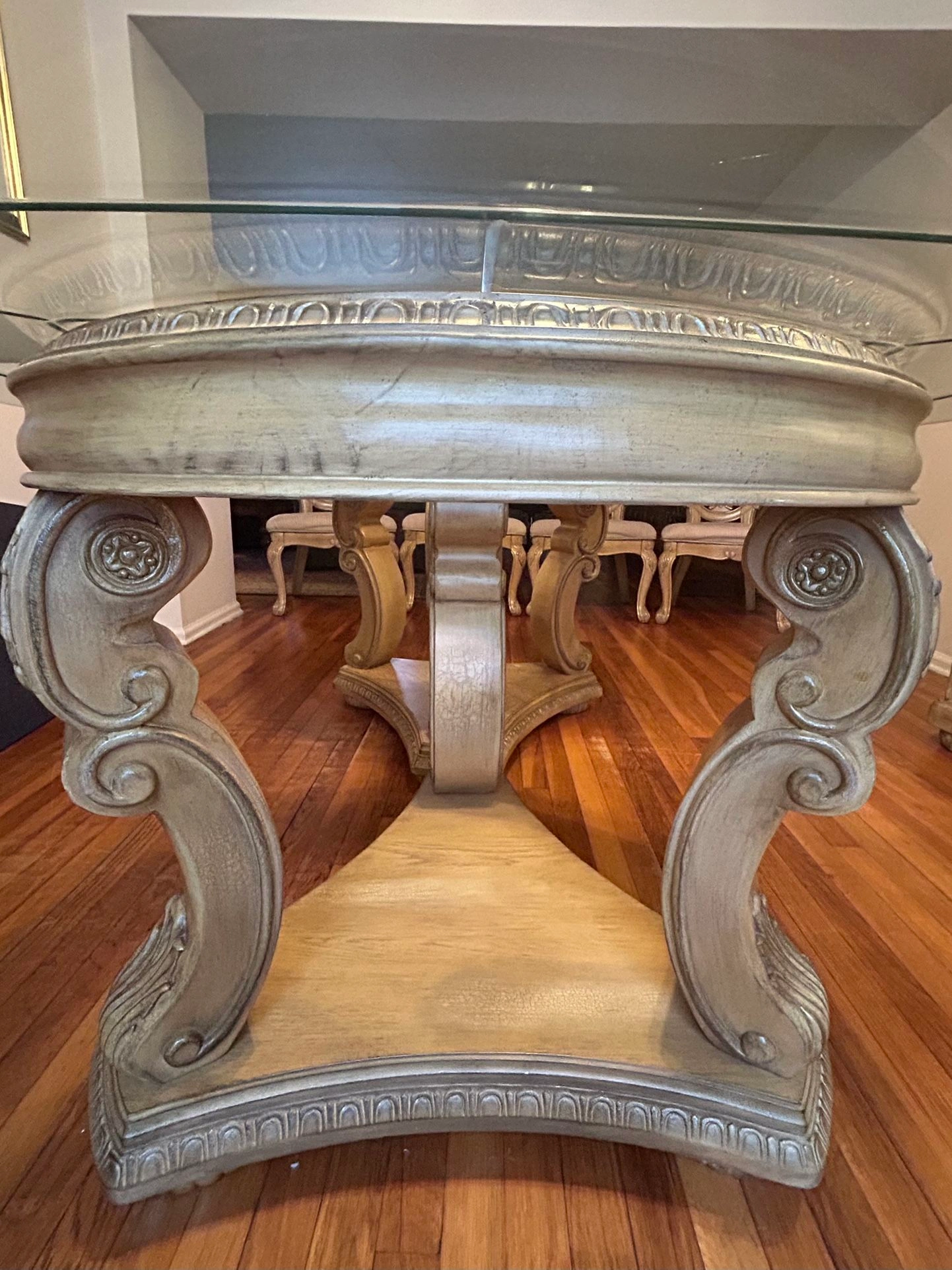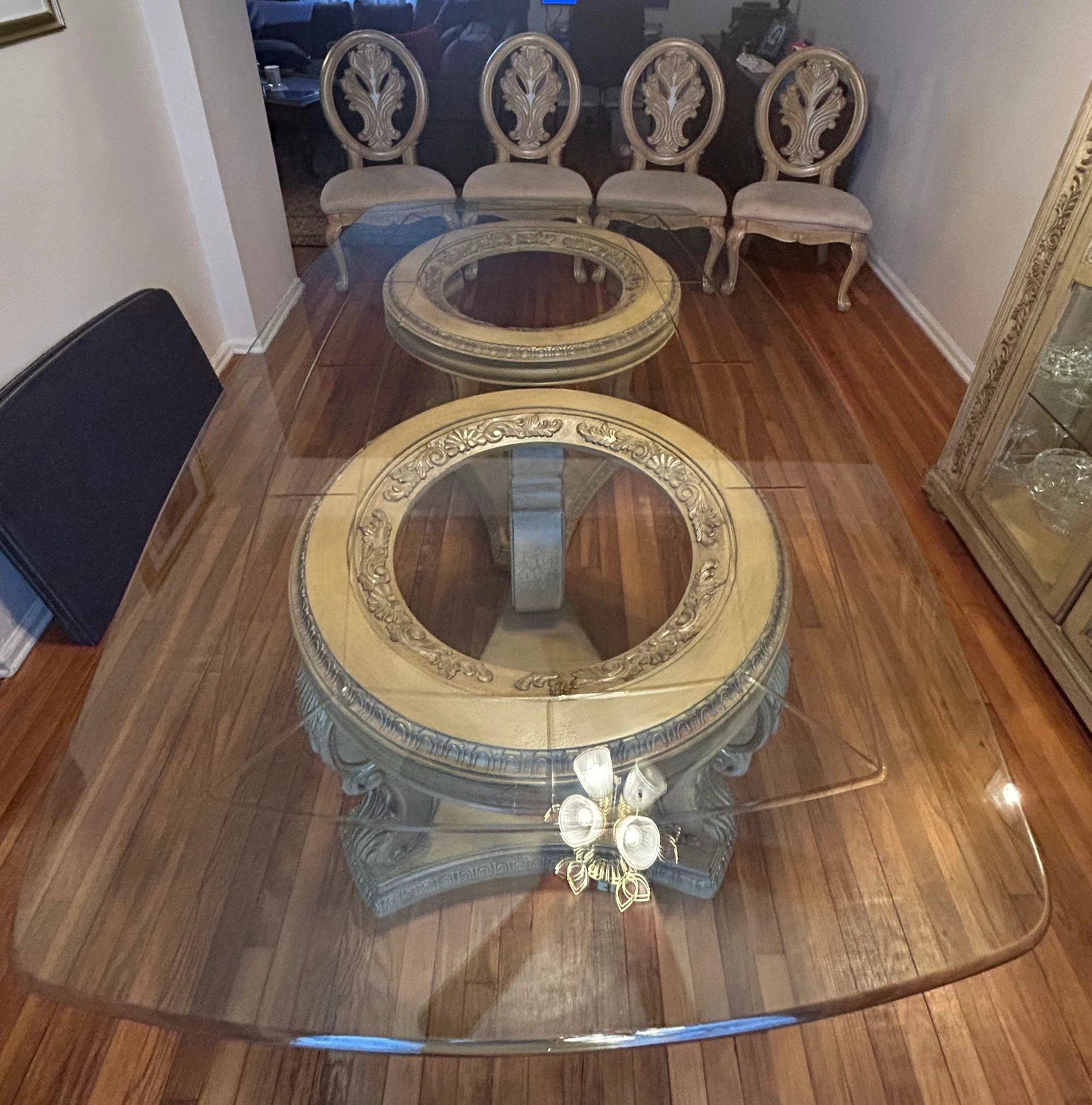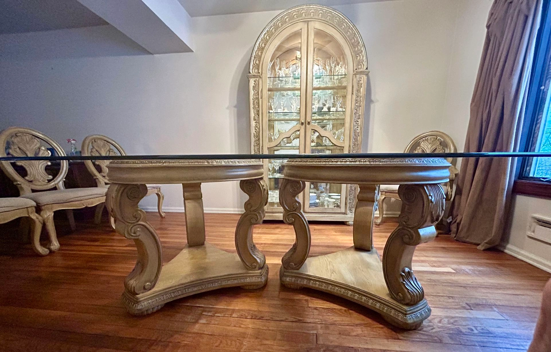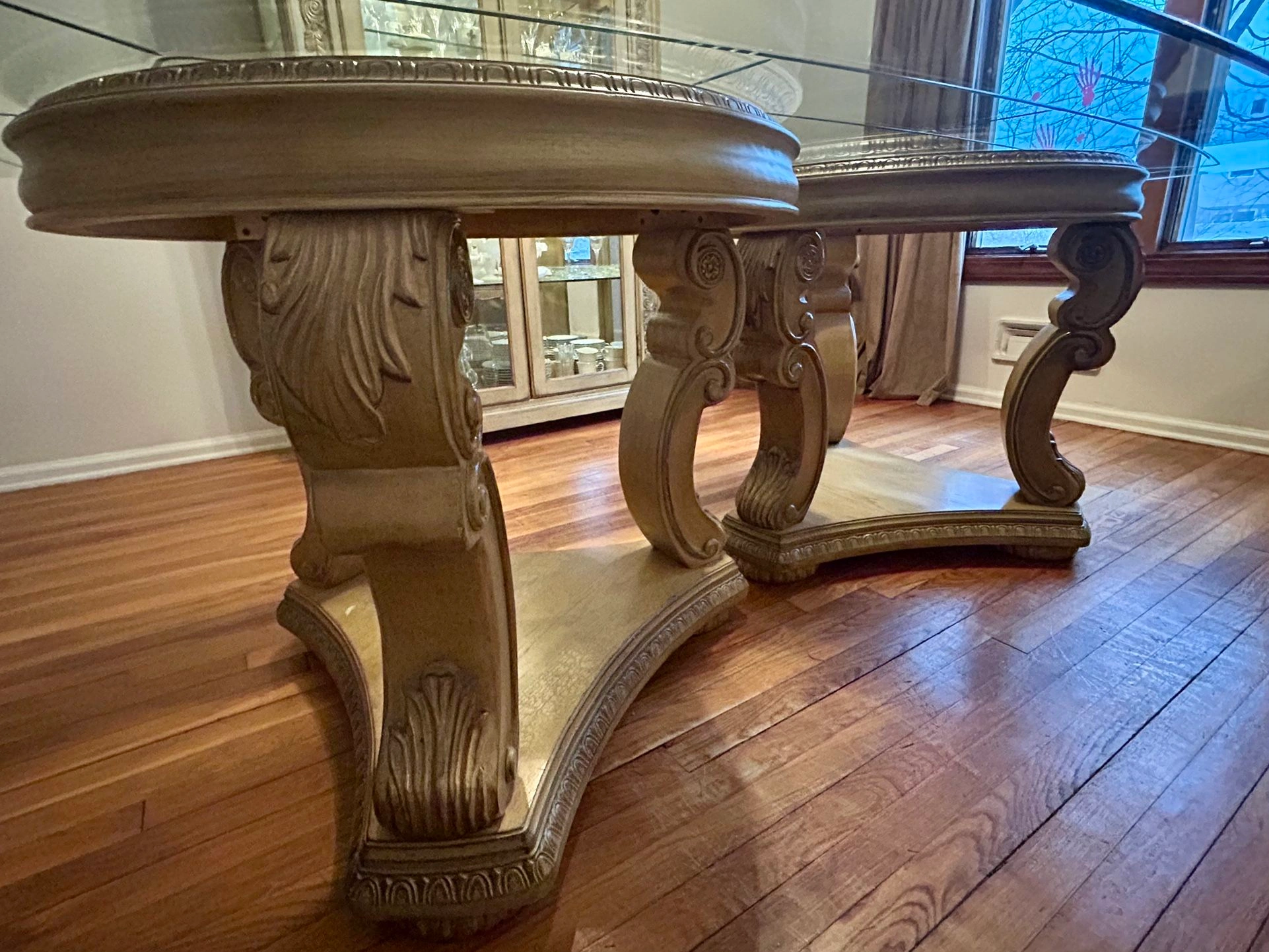 Gorgeous beveled glass top dining set with 2 ornate carved wood