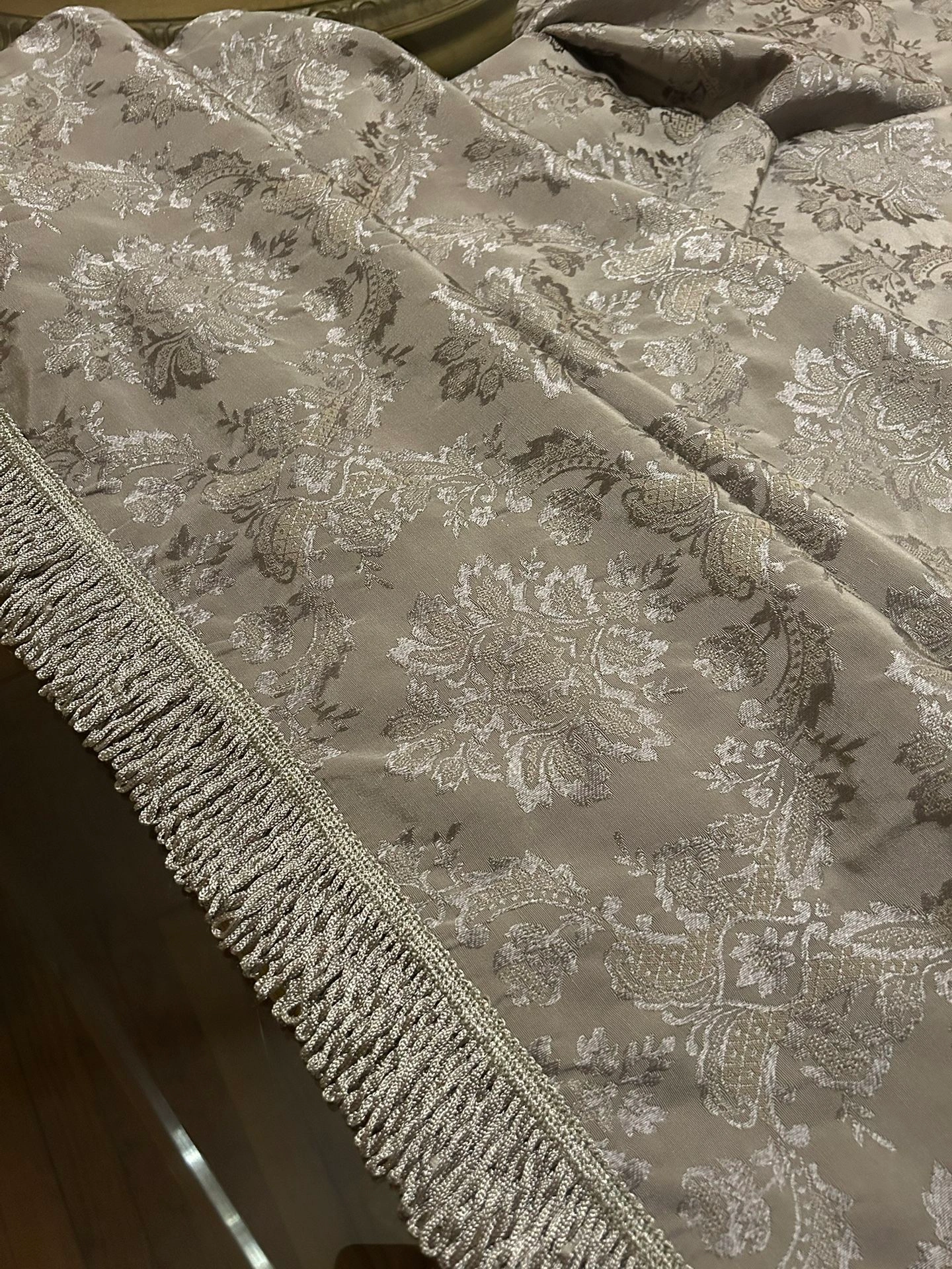 Beautifully detailed dining set. Beveled glass top and two solid wood bases. Matching carved chairs (2 with arms, 6 without arms - fabric may need re-upholstering). Chairs are 41” tall, cushion is 24” wide. Glass table shown is 7ft long, 50” wide. Wooden table bases are 30” wide & 30” in height. Glass table top protector (2 pc.) & green tablecloth included. Also included (not shown) single round beveled glass top for atop one base - 54” wide. Matching curio china cabinet priced & listed separately. Prefer to sell as a set. Solid quality set!