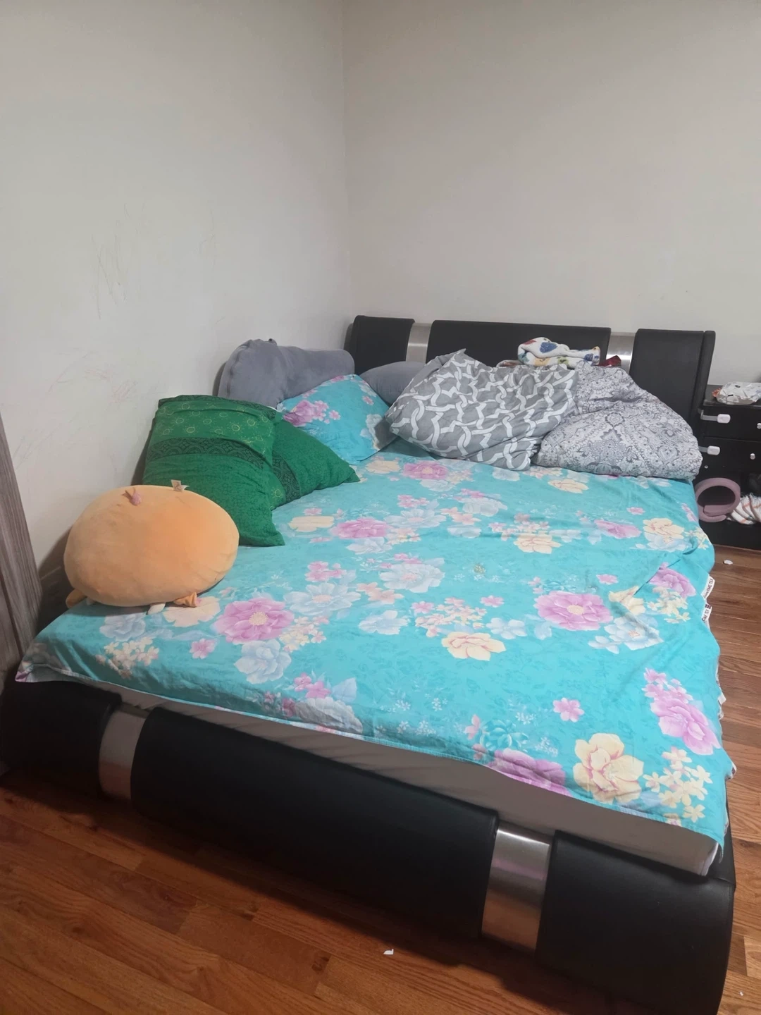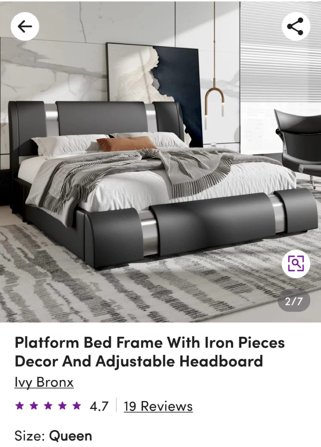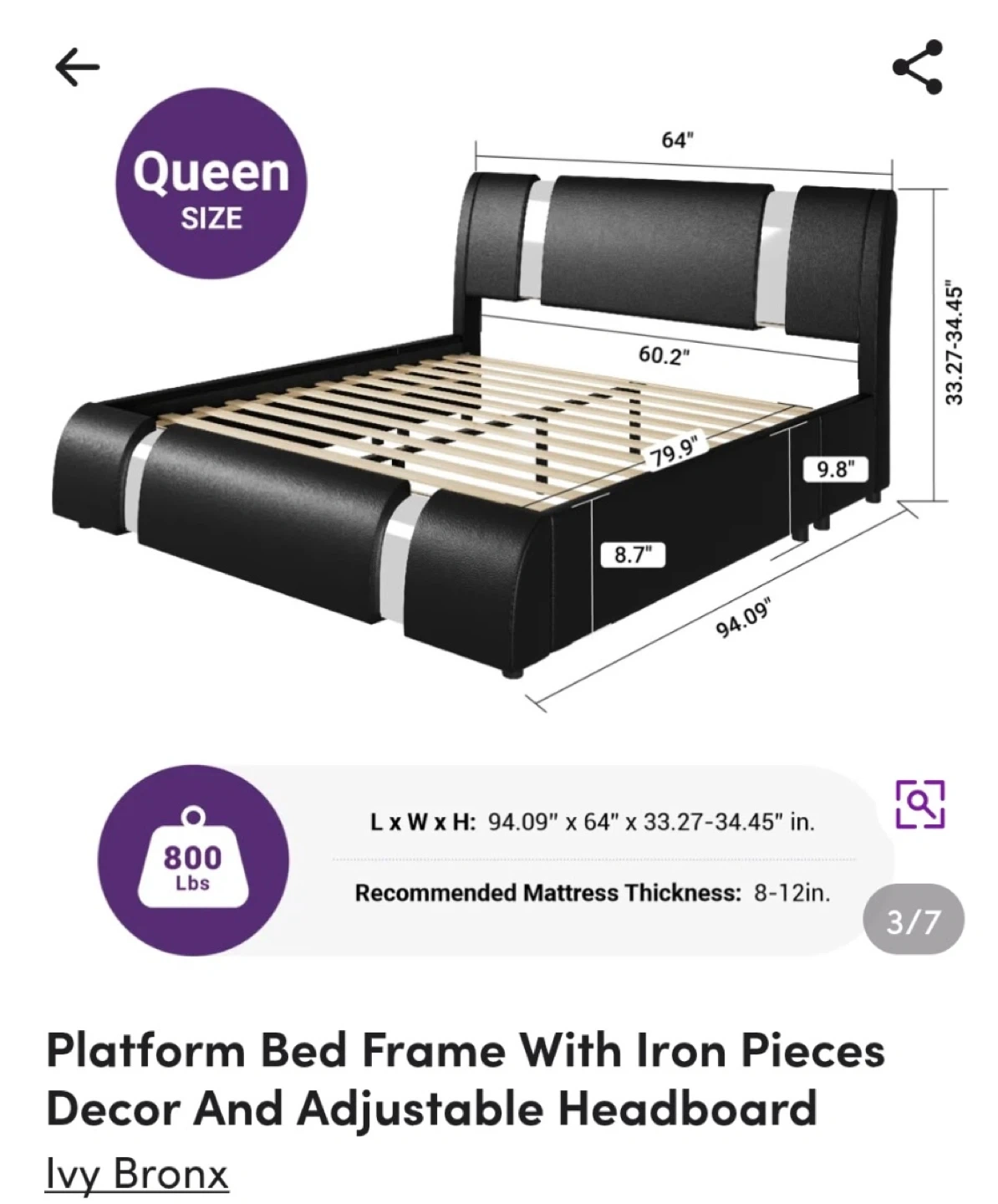 Selling an Ivy Bronx platform bed frame in Queen size. It features iron pieces decor and an adjustable headboard. The dimensions are approximately 94.09" x 64" x 33.27-34.45". Only Bed Frame No Mattress. Ready to go