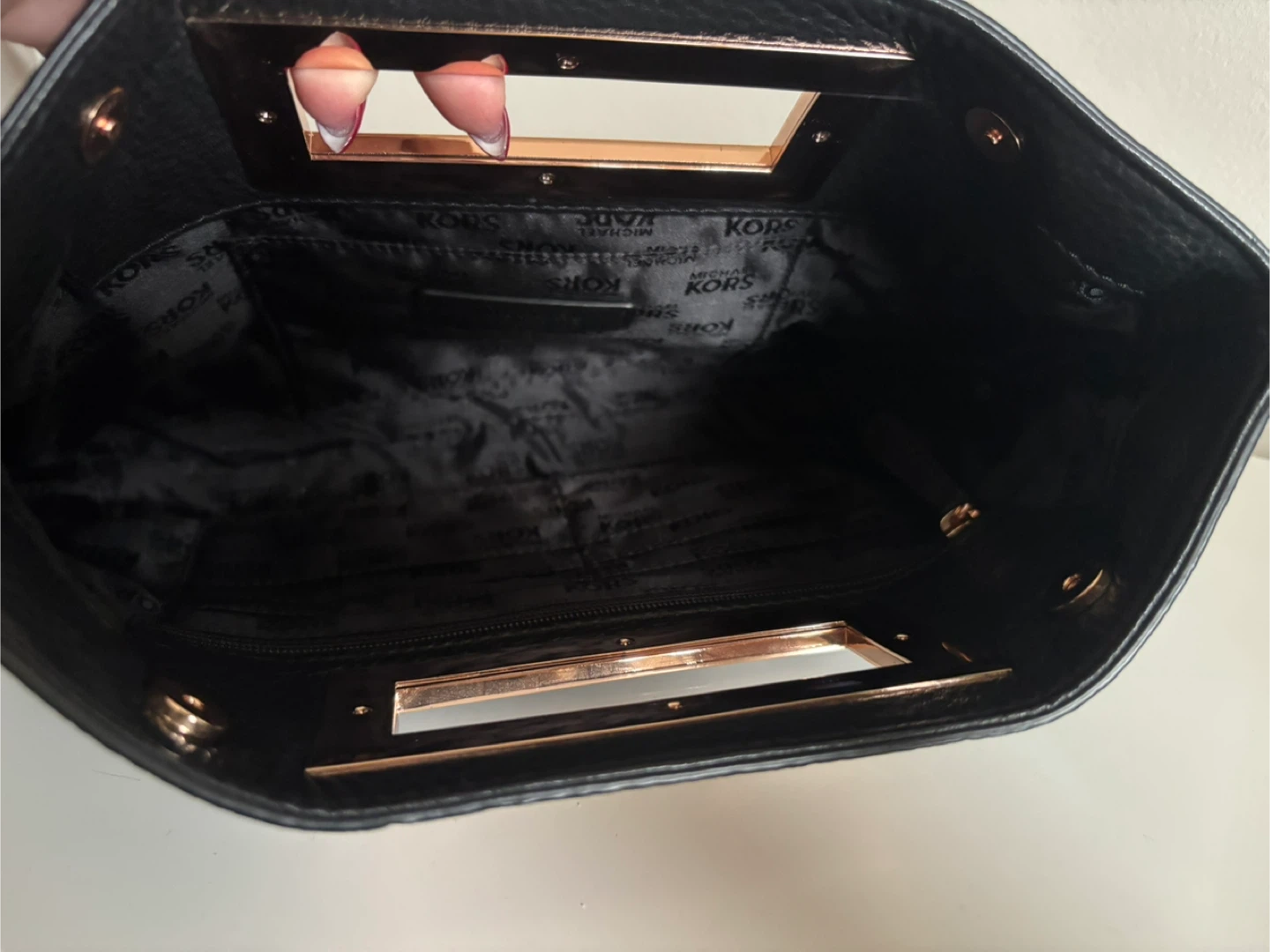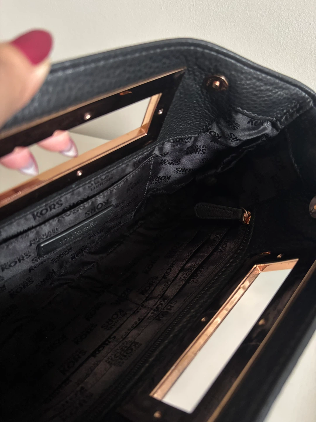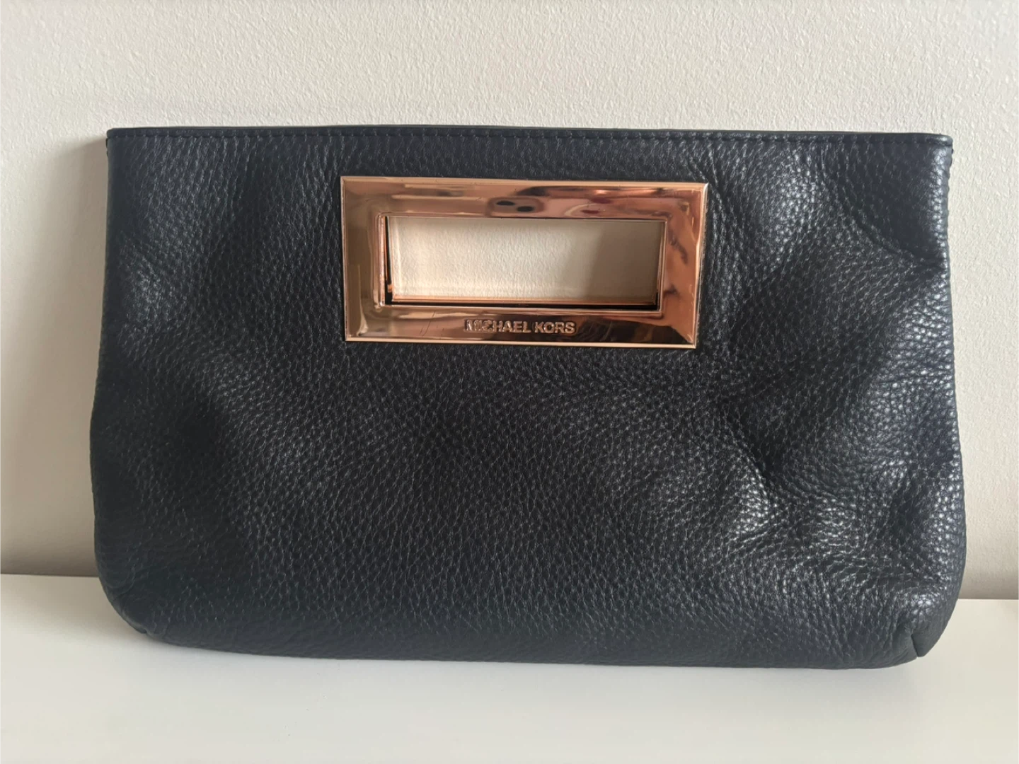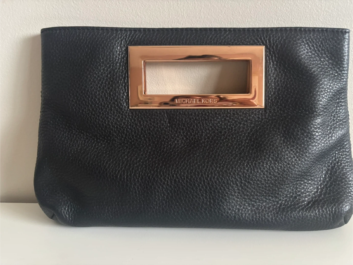 Selling a stylish Michael Kors black leather clutch! It features a unique rose gold-tone metal handle. The interior is lined with MK logo fabric and includes a small zippered pocket. Great for evenings out or special occasions!