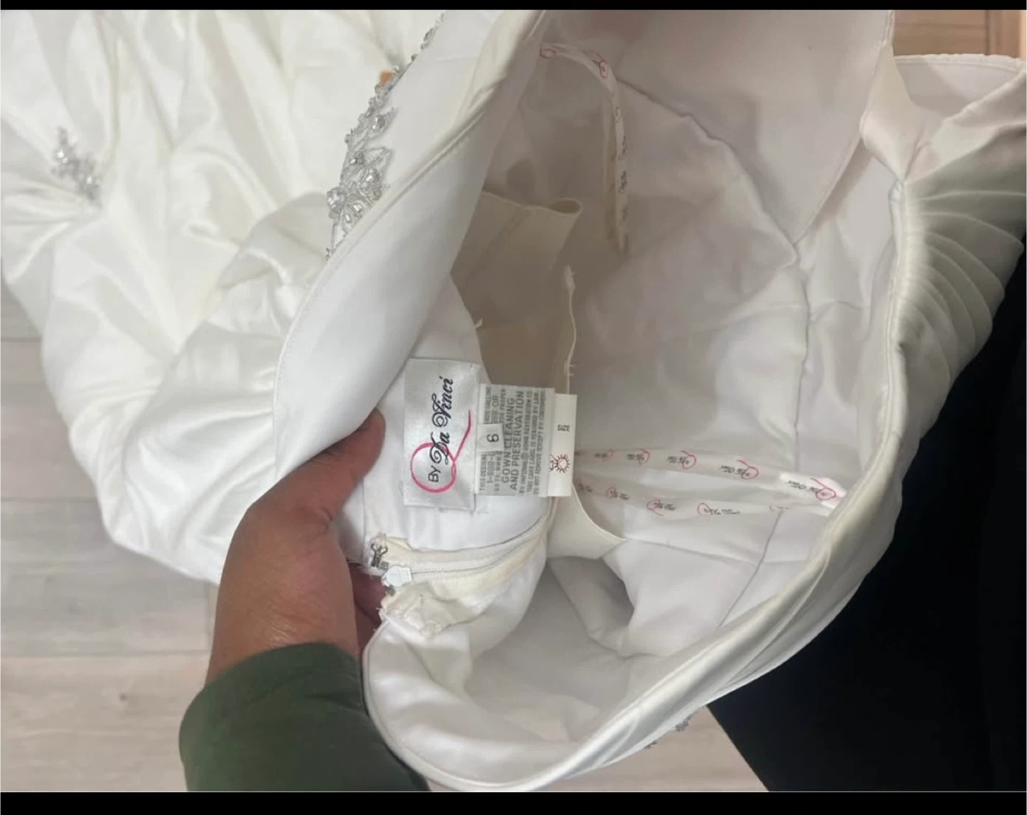 Beautiful ivory wedding dress with beaded embellishments. Includes a matching veil with gold floral accents. Dress size is 6.