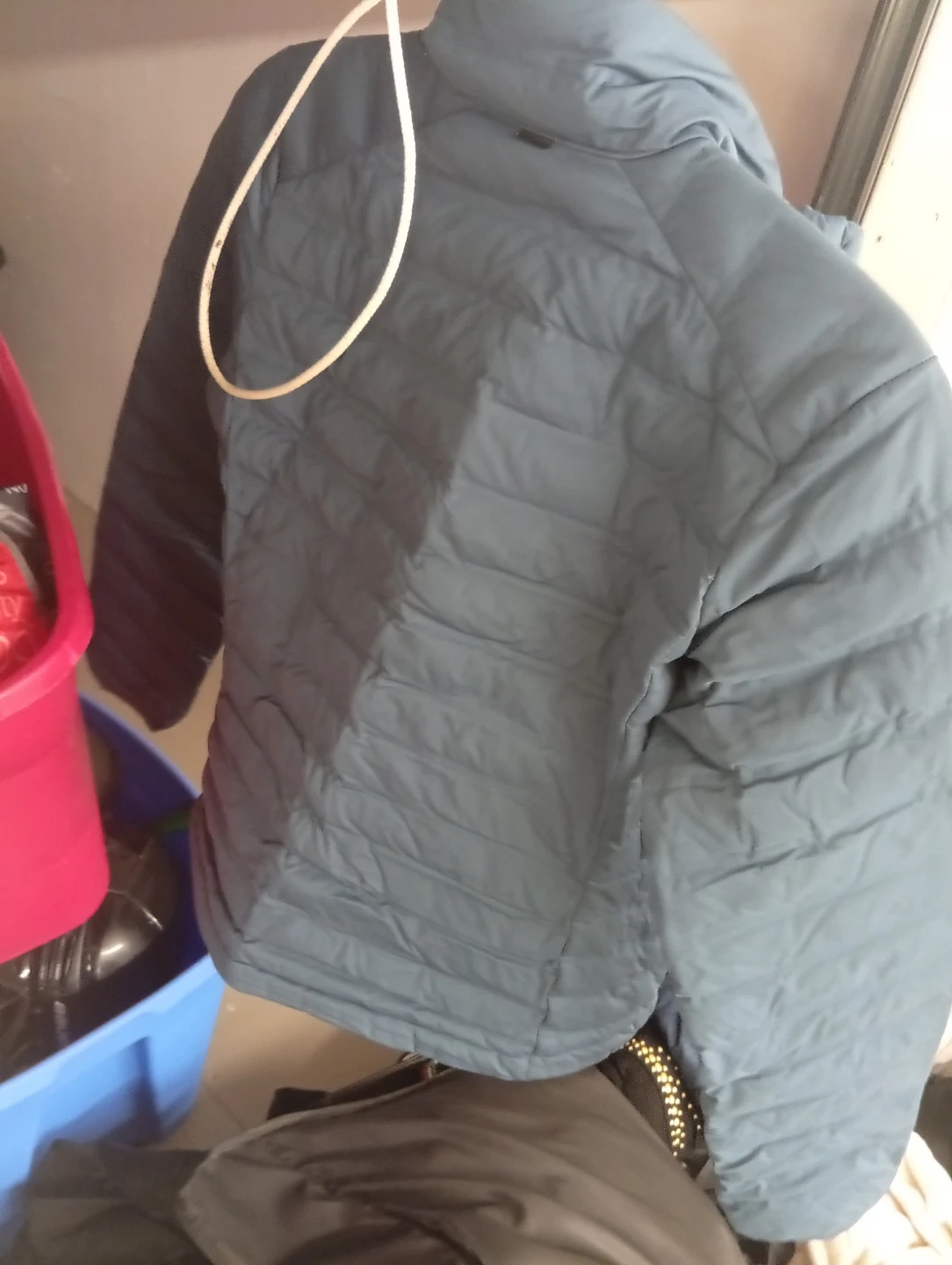 This Columbia puffer jacket is a teal blue colour. It's a lightweight, insulated jacket perfect for cooler weather. It's got a full zip front and two zippered hand pockets. This jacket is suitable for active outdoor use.