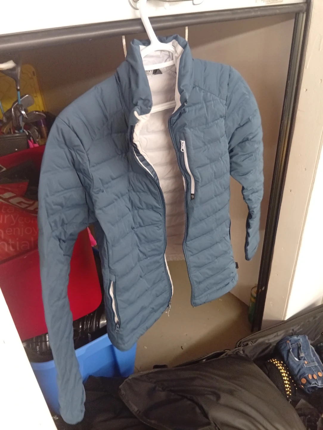 This Columbia puffer jacket is a teal blue colour. It's a lightweight, insulated jacket perfect for cooler weather. It's got a full zip front and two zippered hand pockets. This jacket is suitable for active outdoor use.